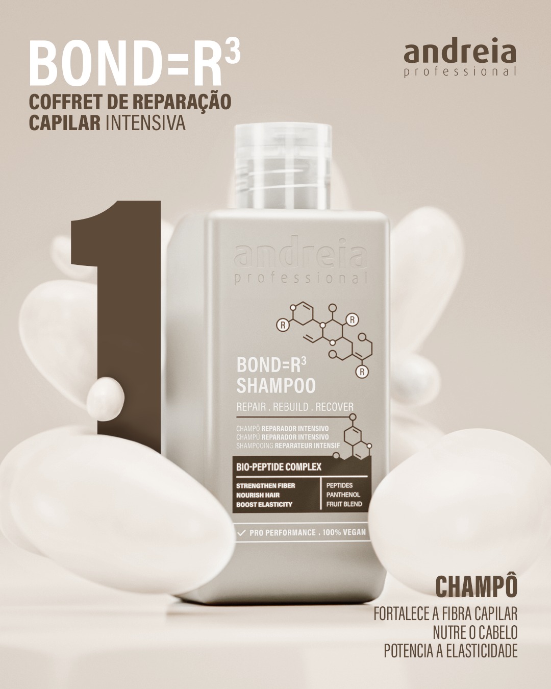 • BOND=R³ Shampoo: Champô reparador intensivo com complexo bio-péptidos, fortalece a fibra capilar, nutre e potencia a elasticidade dos fios.