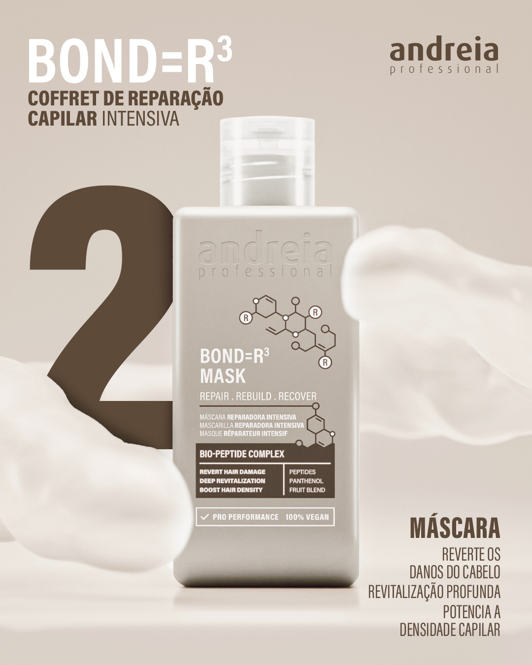 • BOND=R³ Mask: Máscara reparadora intensiva com complexo bio-péptidos, revitaliza profundamente e aumenta a densidade do cabelo.