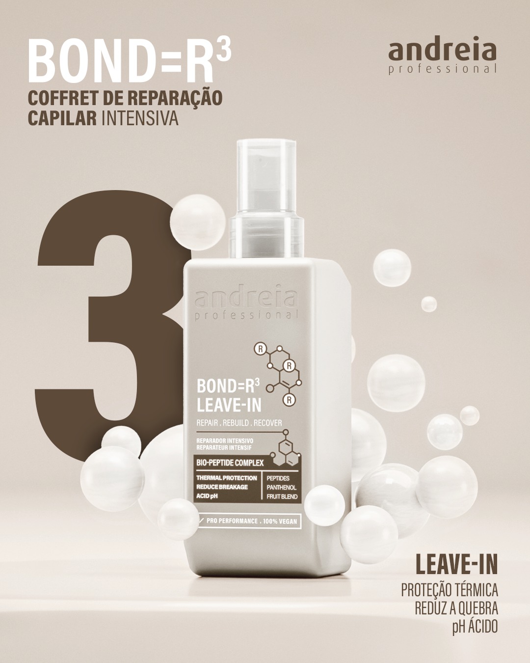 • BOND=R³ Leave-In: Tratamento reparador com complexo bio-péptidos e proteção térmica, reduz a quebra e mantém o cabelo saudável.