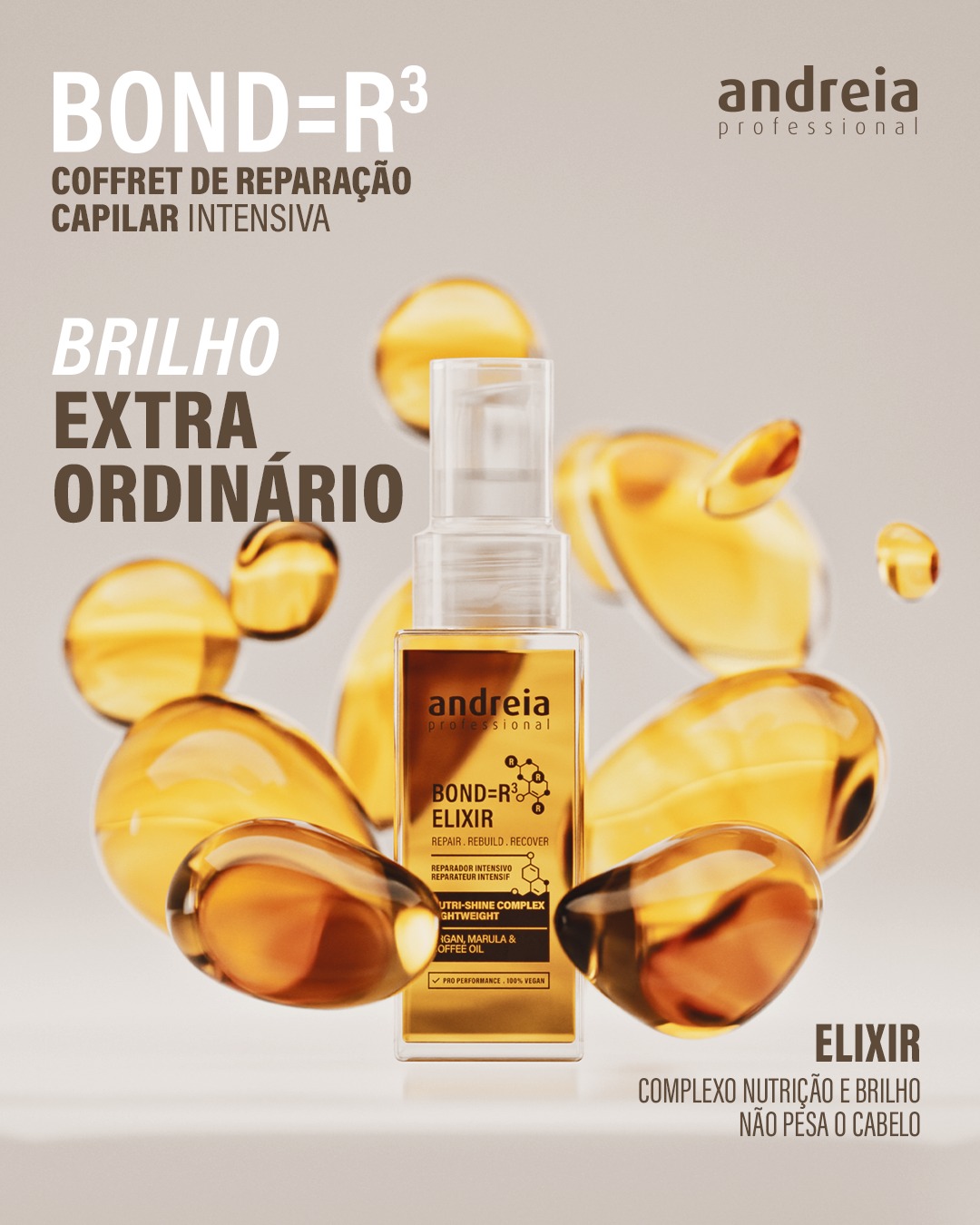 • BOND=R³ Elixir Reparador Intensivo: Finalizador leve, com complexo nutrição e brilho, enriquece com óleos de argão, marula e café. Textura rápida a absorver, sem pesar ou deixar resíduos.