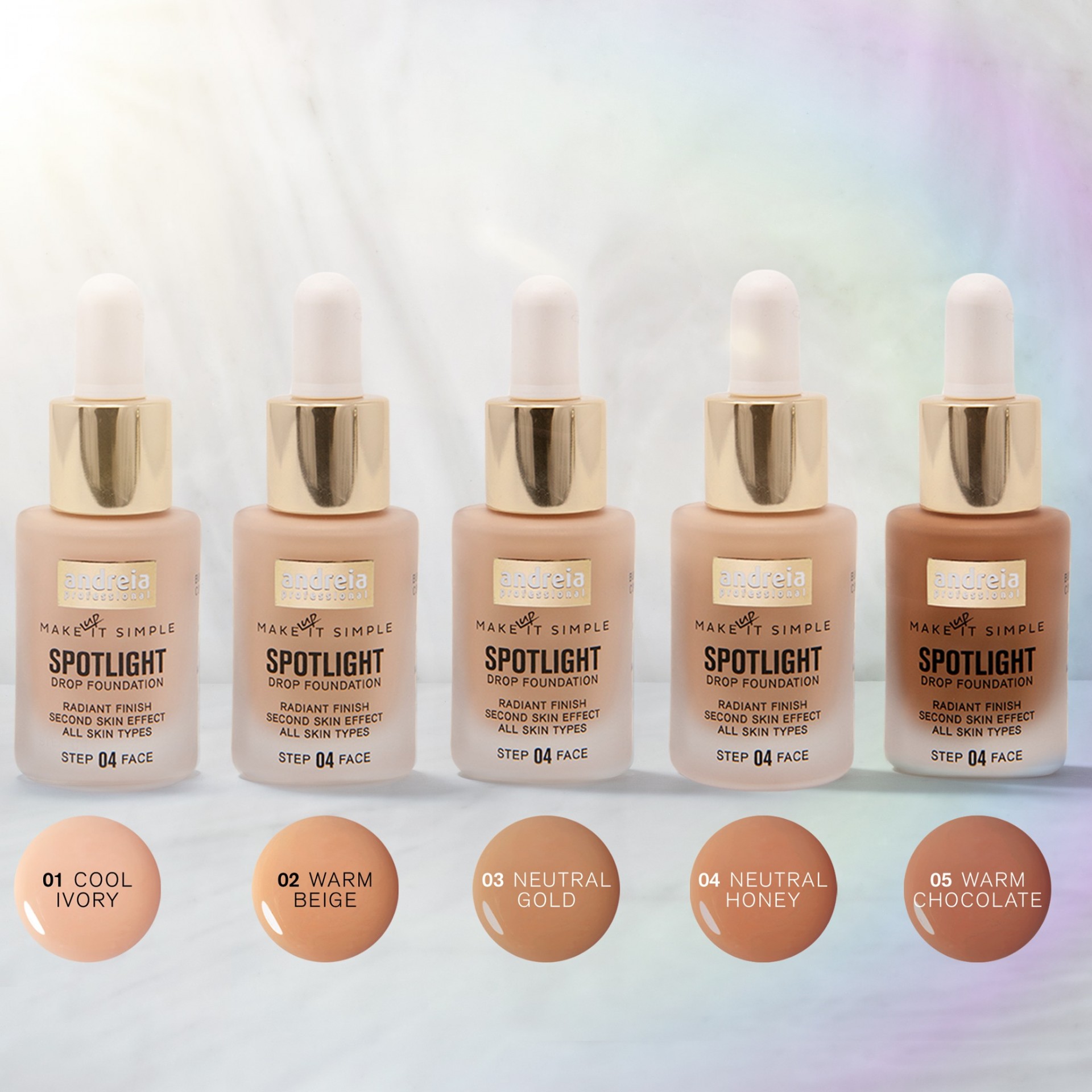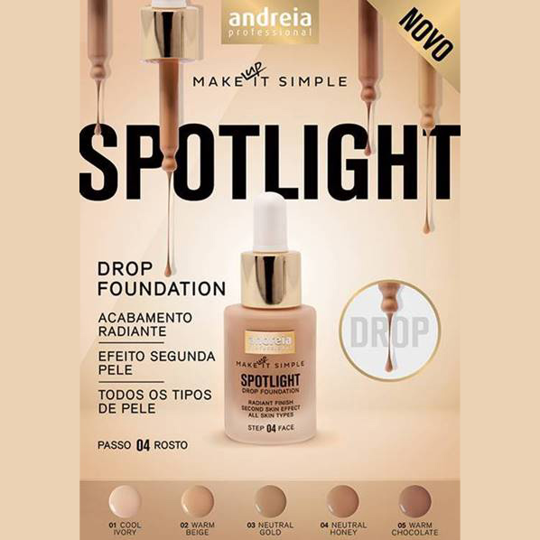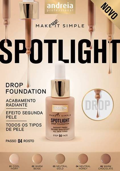 SPOTLIGHT: uma base líquida em conta gotas, efeito segunda pele com acabamento radiante. Disponível em 5 tons.