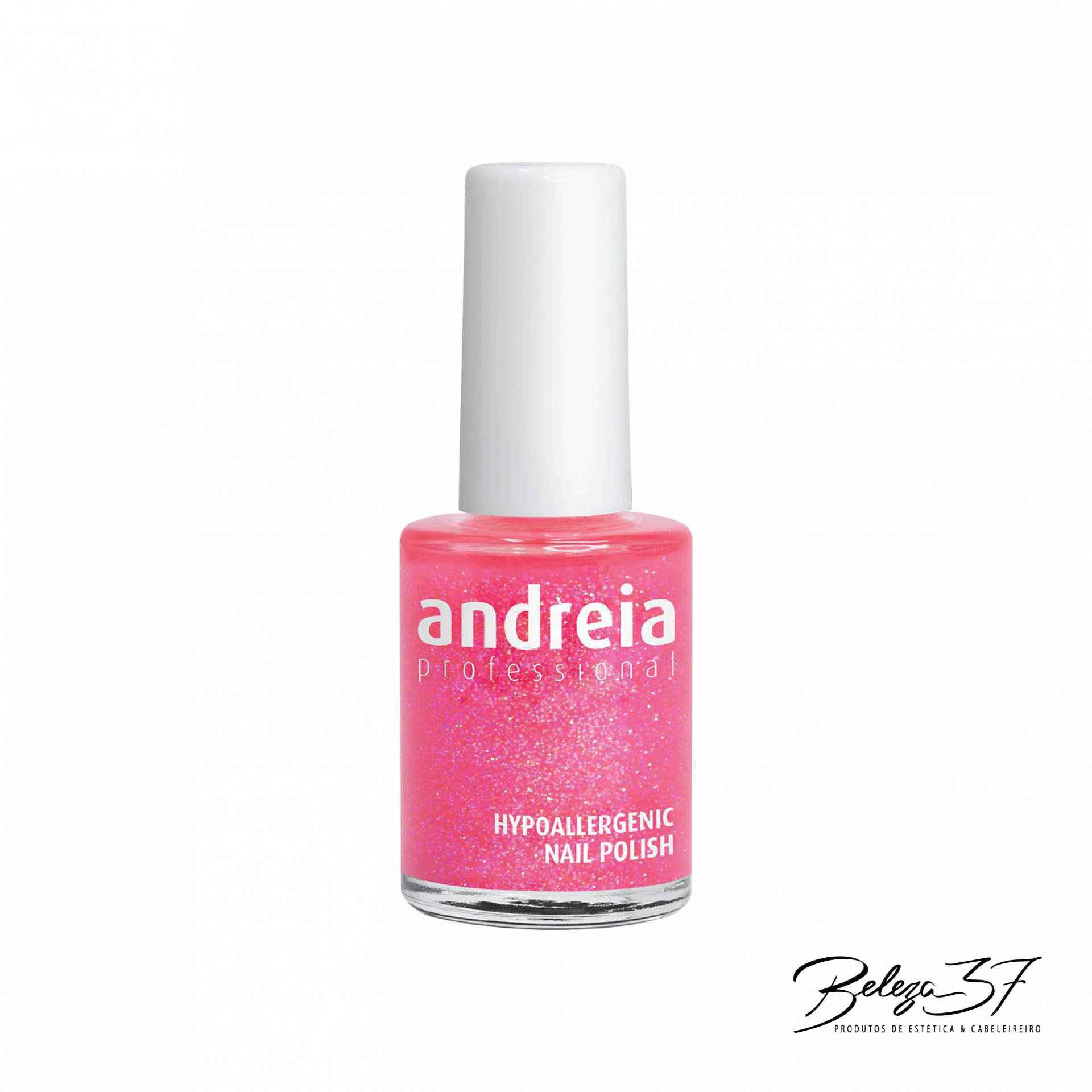 Verniz de unhas rosa com brilhos Andreia Professional em frasco com tampa branca