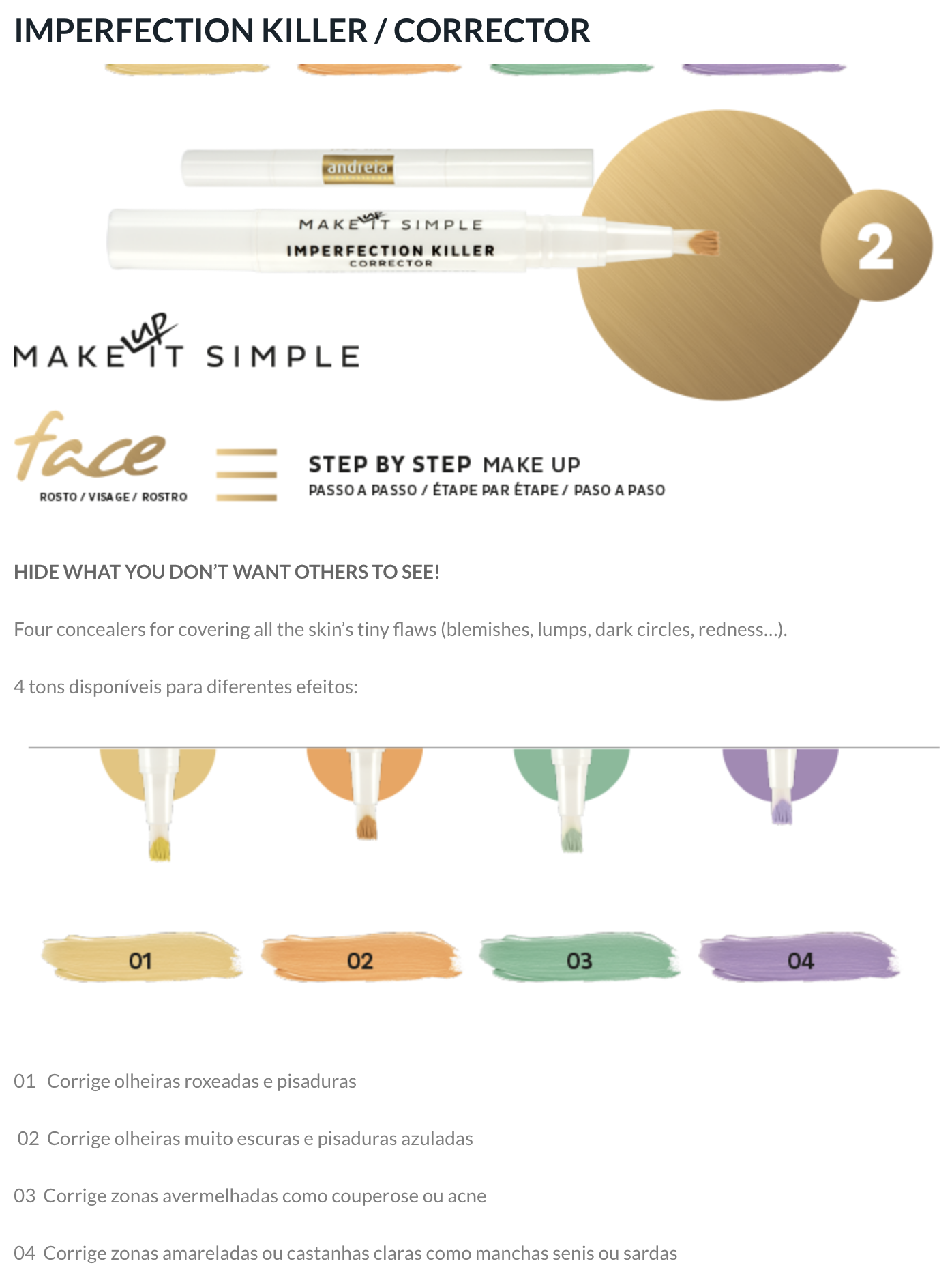 Home Rosto — Corretores Corretor Andreia Face 2 - Imperfection Killer - Corrector 4 Corretor Andreia Face 2 - Imperfection Killer - Corrector 4 1 unidades em stock | SKU: B2328P.04 5,99 € Desconto de %. IVA incluído. Comprar Contactar Adicionar à wishlist Corretores facetas a cobrir todas as pequenas imperfeições da pele (manchas, borbulhas, olheiras, vermelhões ...). TONS DISPONÍVEIS: - Corretor 01 - Corretor 02 - Corretor 03 - Corretor 04 ROSTO: https://www.beleza37.pt/category/andreia-face OLHOS: https://www.beleza37.pt/category/andreia-eyes LÁBIOS: https://www.beleza37.pt/category/andreia- lips ESSENCIAIS: https://www.beleza37.pt/category/andreia-essentials Marca Andreia Professional Ver vídeo Partilhar