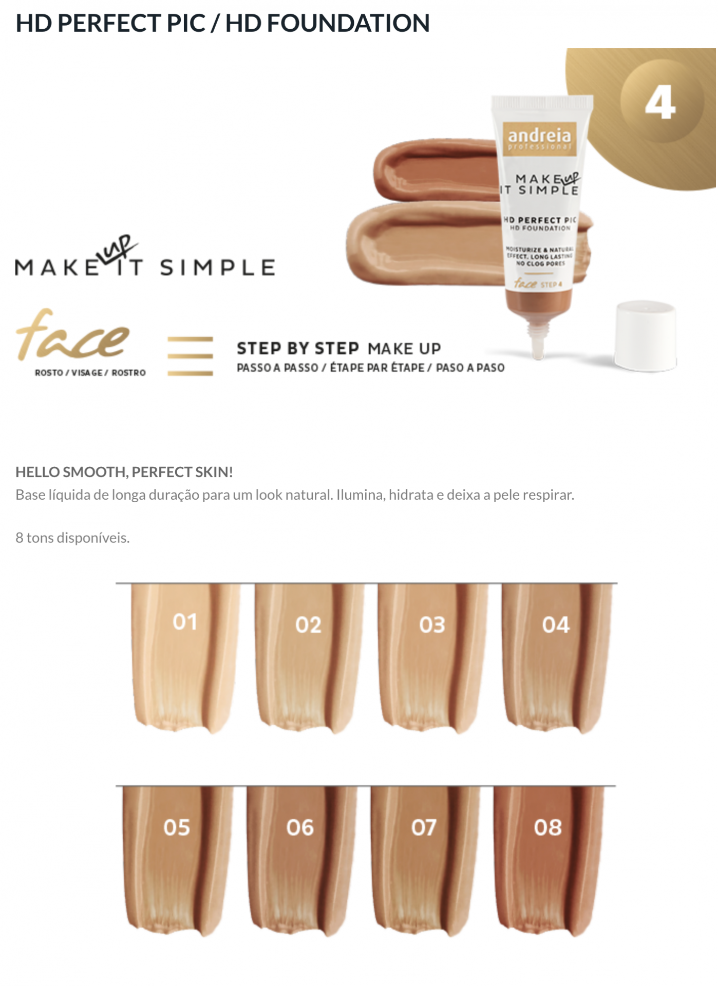 Home Rosto — Bases Base Líquida Andreia Face 4 - HD Perfect Pic / HD Foundation - Tonalidade 1 Base Líquida Andreia Face 4 - HD Perfect Pic / HD Foundation - Tonalidade 1 2 unidades em stock | SKU: B2331P.01 10,99 € Desconto de %. IVA incluído. Compre este produto e ganhe 54 Pontos! Comprar Contactar Adicionar à wishlist HELLO SMOOTH, PERFECT SKIN!Base líquida de longa duração para um look natural. Ilumina, hidrata e deixa a pele respirar. 8 tons disponíveis Marca Andreia Professional Características Ver vídeo Partilhar