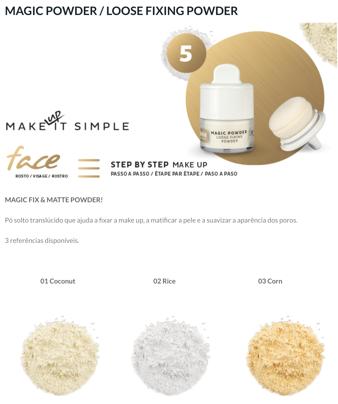 Disponível em 3 tons: 01 Coconut, 02 Rice, 03 Corn