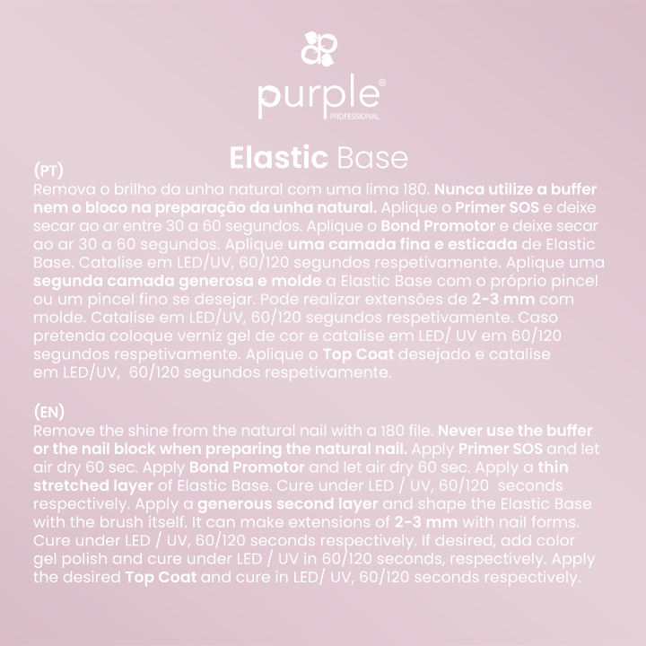 Elastic Base é uma base de alta viscosidade que permite excelente adesão e preenche as estrias da unha natural. Pode ser aplicada em várias camadas e permite extensões de 2-3mm com molde.
