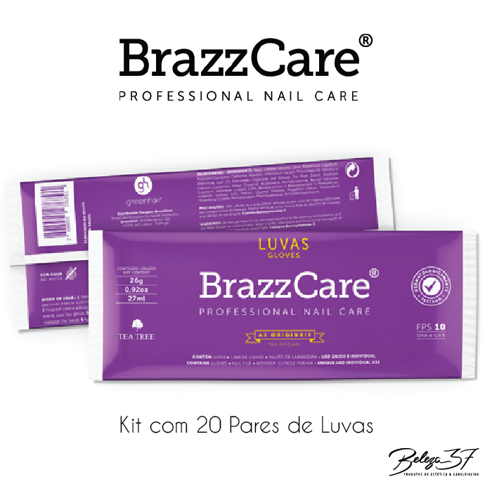 COMO USAR: Abrir o kit BrazzCare®, retirar as luvas, a lima e o pau de laranjeira. Retirar o verniz e limar as unhas.