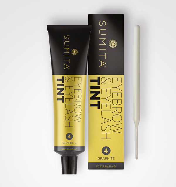 Tubo e caixa de tinta para sobrancelhas e pestanas SUMITA cor graphite com aplicador branco