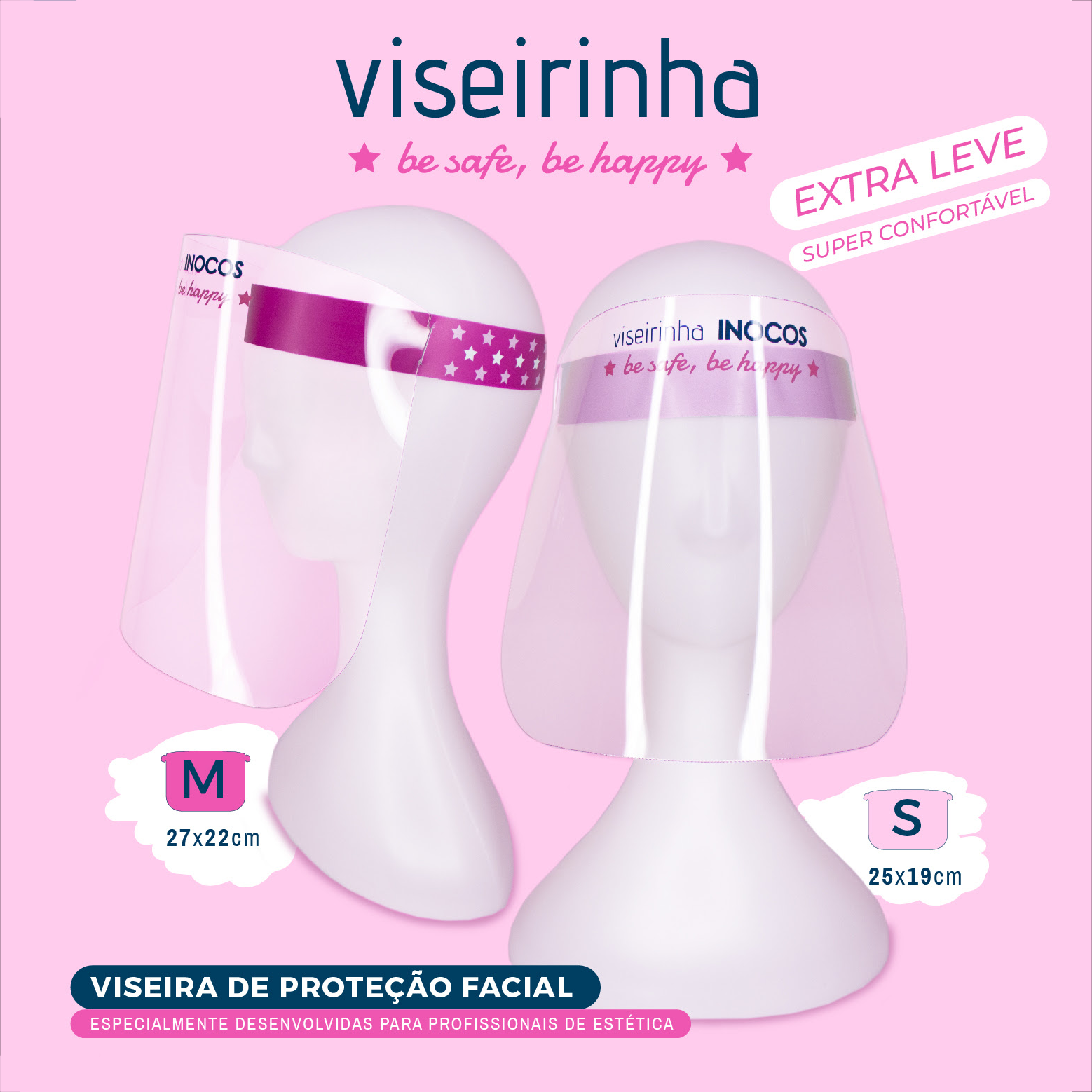 Duas viseiras de proteção facial transparentes com bandas rosas em manequins brancos sobre fundo rosa