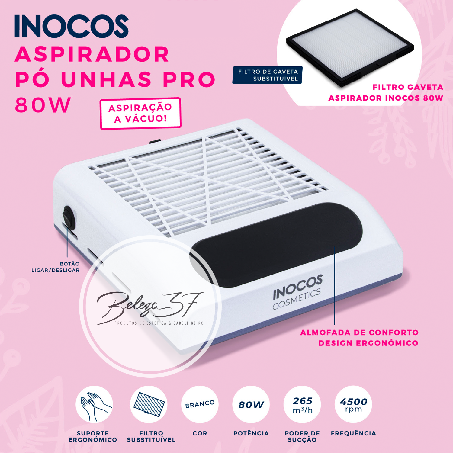 Home Aspiradores Aspirador Pó Unhas Inocos PRO 80W -5% Aspirador Pó Unhas Inocos PRO 80W SKU: B3322 60,80 € 64,00 € Desconto de 5%. IVA incluído. Desconto do dia do Pai Desconto imediato de 3,20 € (5%) neste produto. Válido de 16 de Março de 2026 às 00:00 até 23 de Março de 2026 às 00:00. Compre este produto e ganhe 304 Pontos! Comprar Contactar Adicionar à wishlist Características: Cor - Branco Potência - 80W Poder de Sucção - 265m³/h Frequência - 4500 rpm 1 filtro incluído. Medidas: 25,8cm x 24,1cmx 9,7cm Os filtros não são laváveis. Podem ser aspirados ou passados por um compressor. Pode encomendar filtros extra aqui: https://www.beleza37.pt/product/b3323 Marca Inocos Características Partilhar