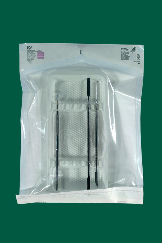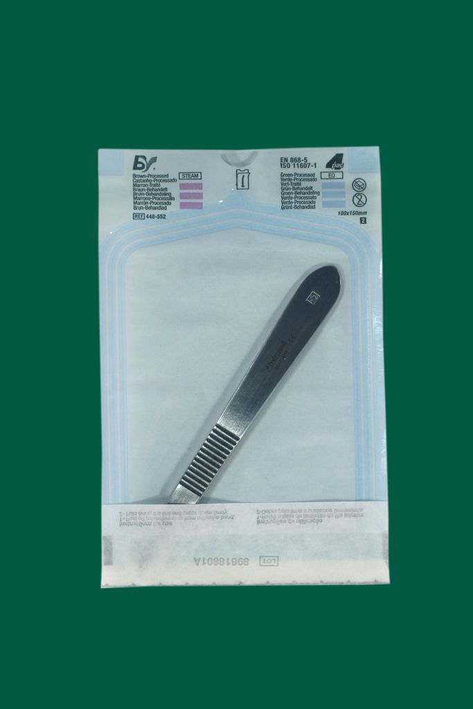 - Fabricados em papel de grau médico de 60 g/m² e filme laminado em poliéster e polipropileno azul de 52 μ.