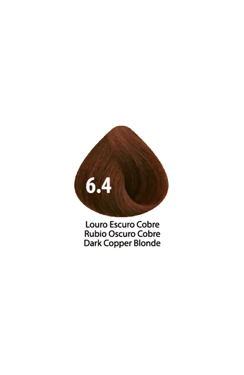 Amostra de cor de cabelo castanho escuro com reflexos cobre e número 6.4