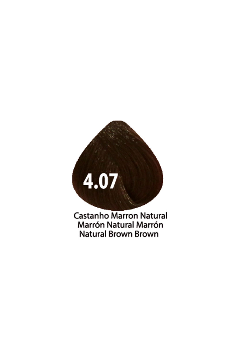 Amostra de cor de cabelo castanho natural 4.07 com texto descritivo