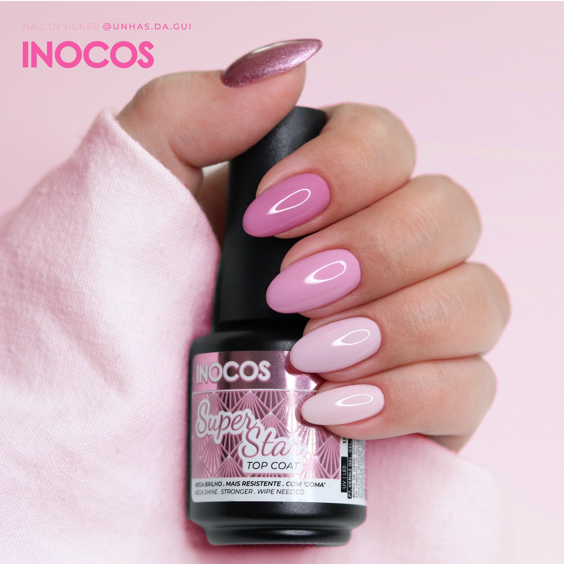 As 5 cores usadas na imagem são: 71 - Perlimpimpim Rosa, 234 - Abraçar até apertar, 59 - Algodão doce, 12 - Caixinha de música e 5 - Bailarina. Finalizado com o Super Star - Top Coat Inocos