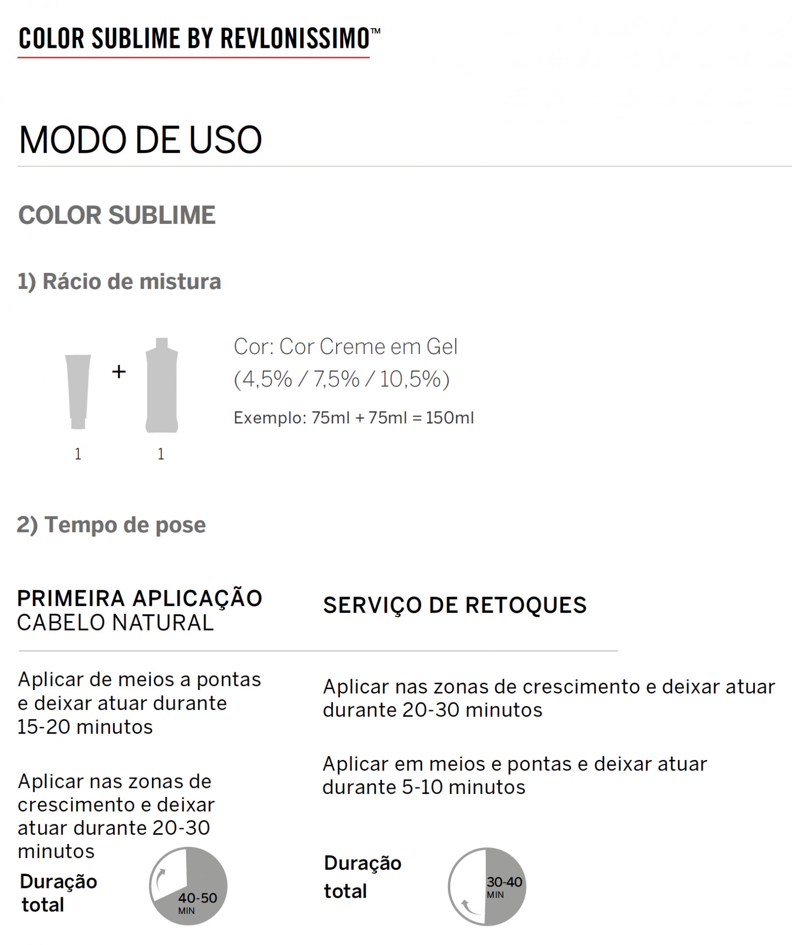 b) Serviço de retoques: Aplicar nas zonas de crescimento e deixar atuar durante 20-30 minutos. Aplicar em meios e pontas e deixar atuar durante 5-10 minutos. Tempo total: 30 a 40 minutos.
