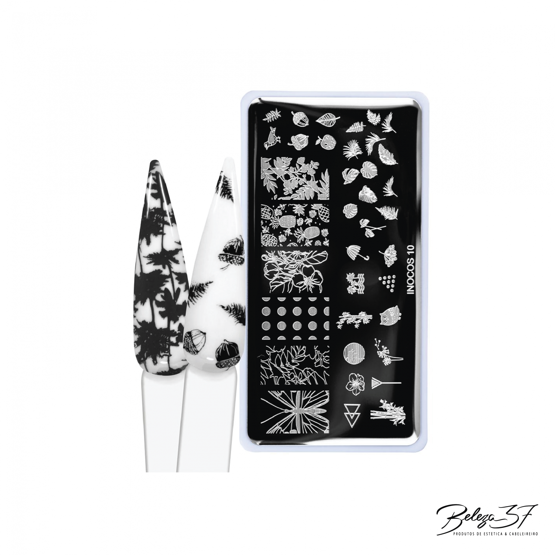 Placa em aço inoxidável com gravuras de padrões diversos para a técnica de nail art stamping.