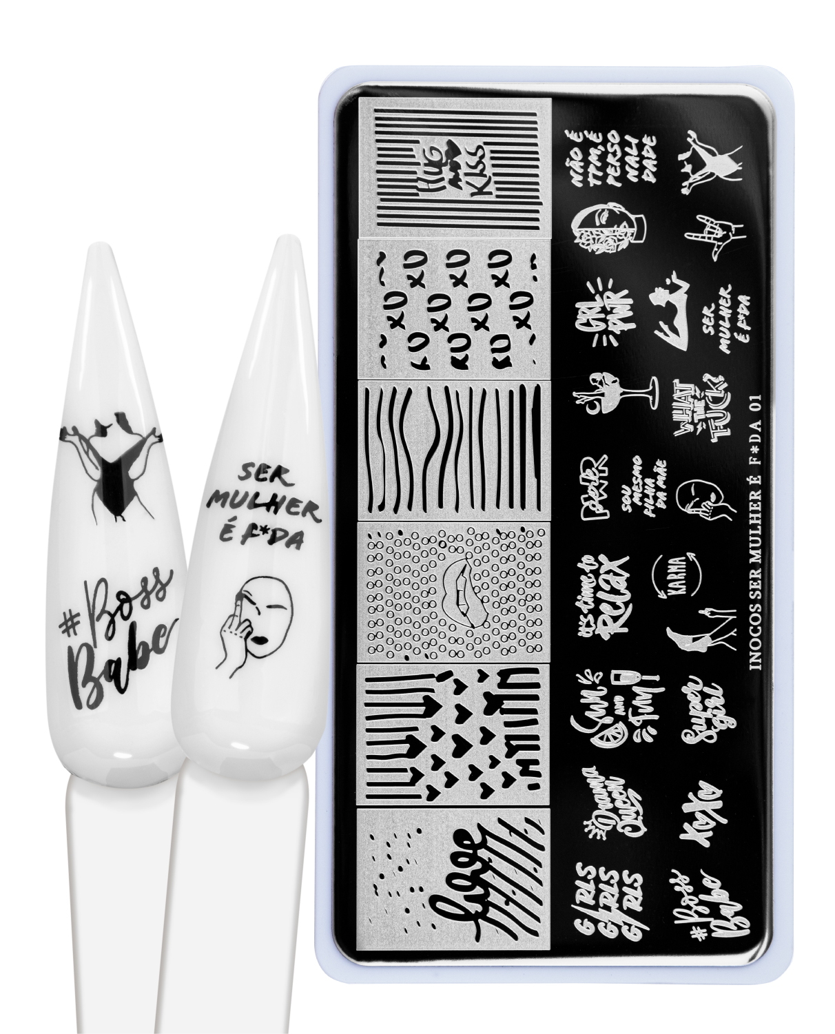 Placa em aço inoxidável com gravuras de padrões diversos para a técnica de nail art stamping.