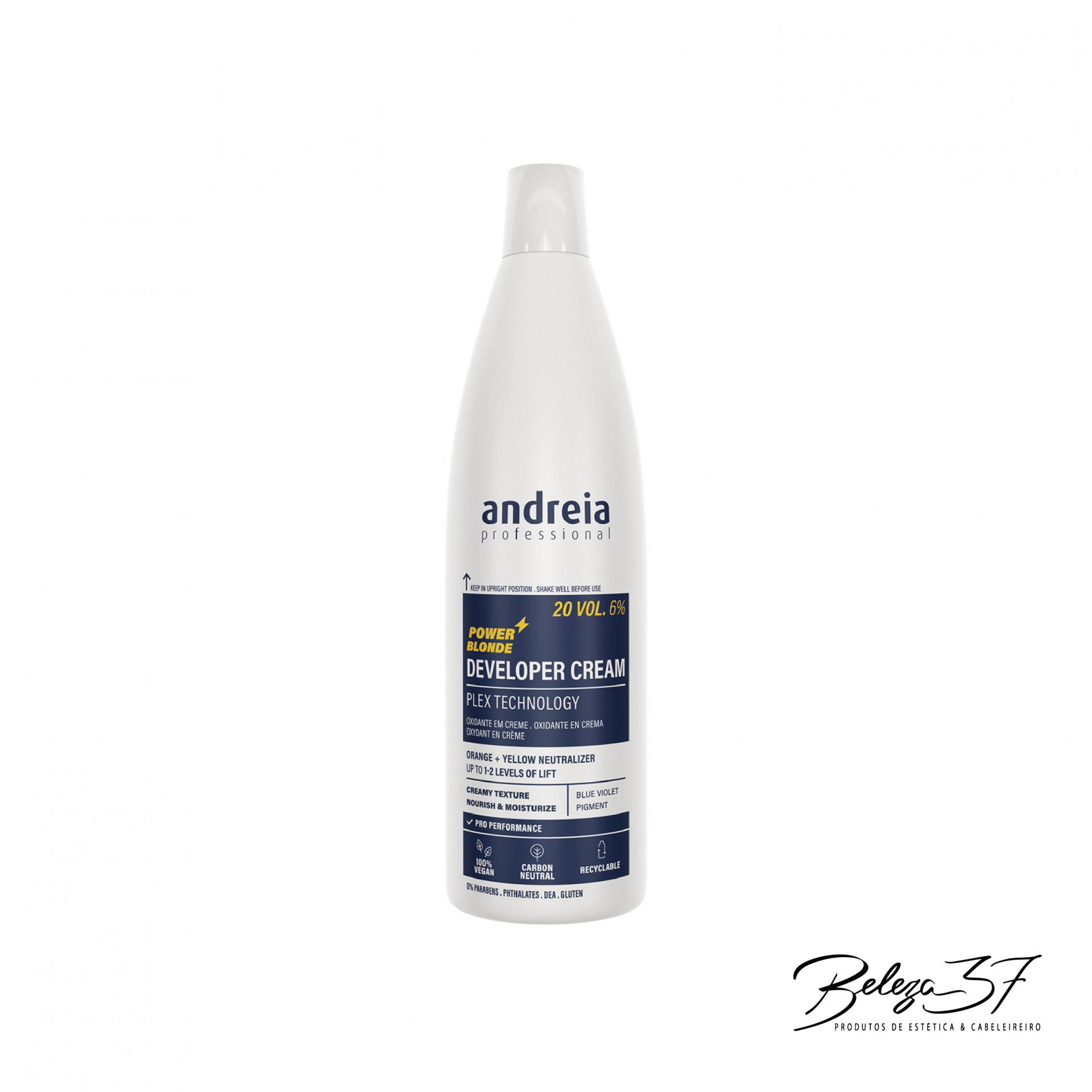 Oxidante Cabelo Developer Power Blond 20Vol. 6% 1L, da Andreia Profissional, para todos os tipos de cabelo neutraliza os tons alaranjados e amarelados.
