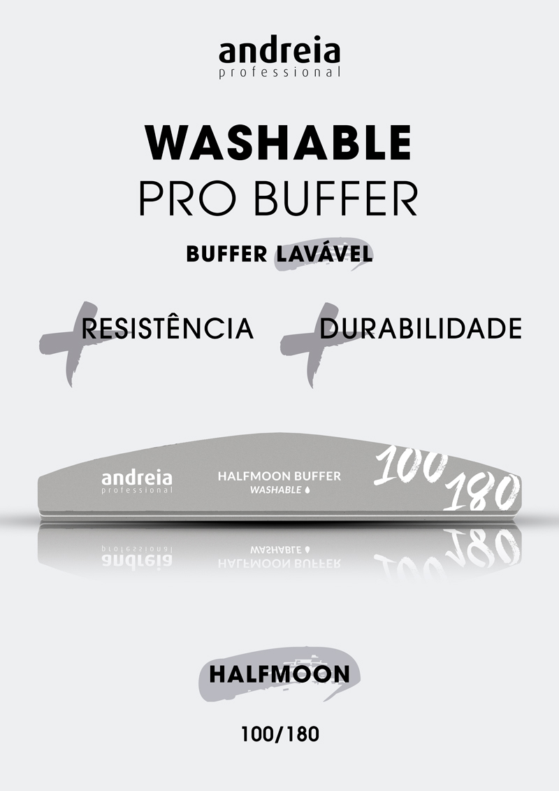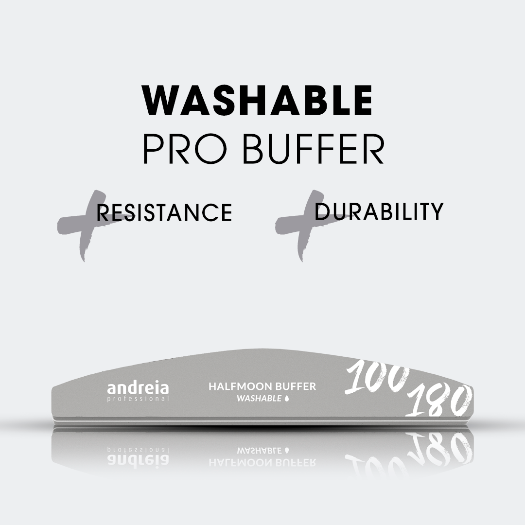 Buffer lavável com elevada resistência e durabilidade. Formato ergonómico em meia lua e gramagem 100/180 para eliminar as irregularidades e uniformizar a unha.