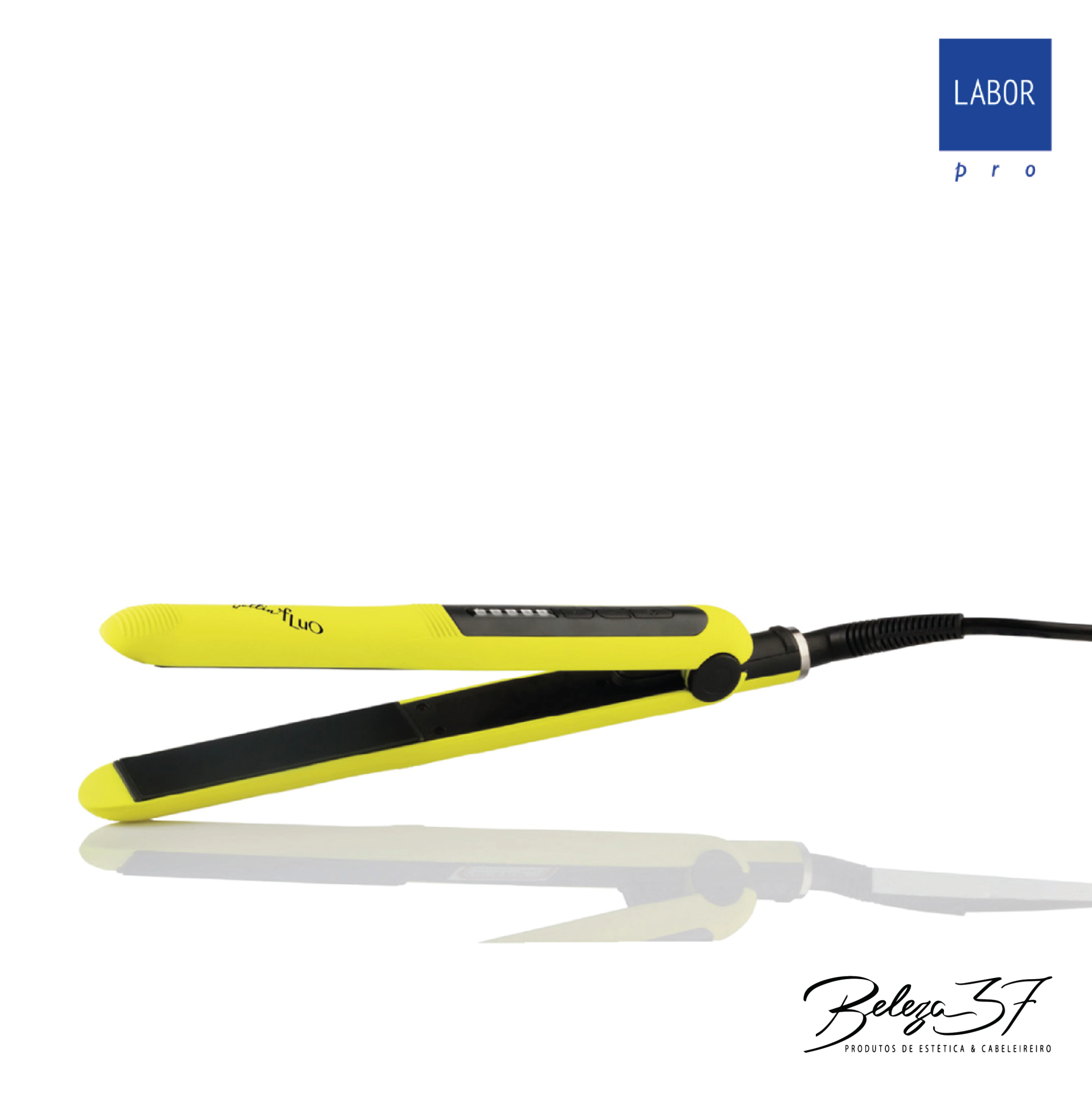 Prancha alisadora de cabelo amarela e preta com display digital e cabo elétrico em superfície branca