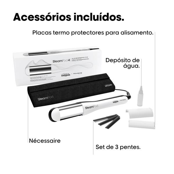 Os seus acessórios exclusivos, incluem: 3 pentes para qualquer tipo de cabelo + 1 necessaire térmico + 2 placas termo protetoras para um alisamento seguro + Oferta de bolsa*