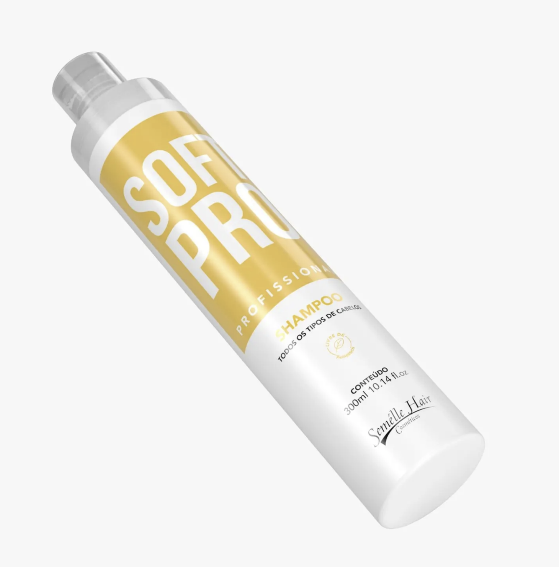 Frasco branco de champô Soft Pro com rótulo amarelo e branco