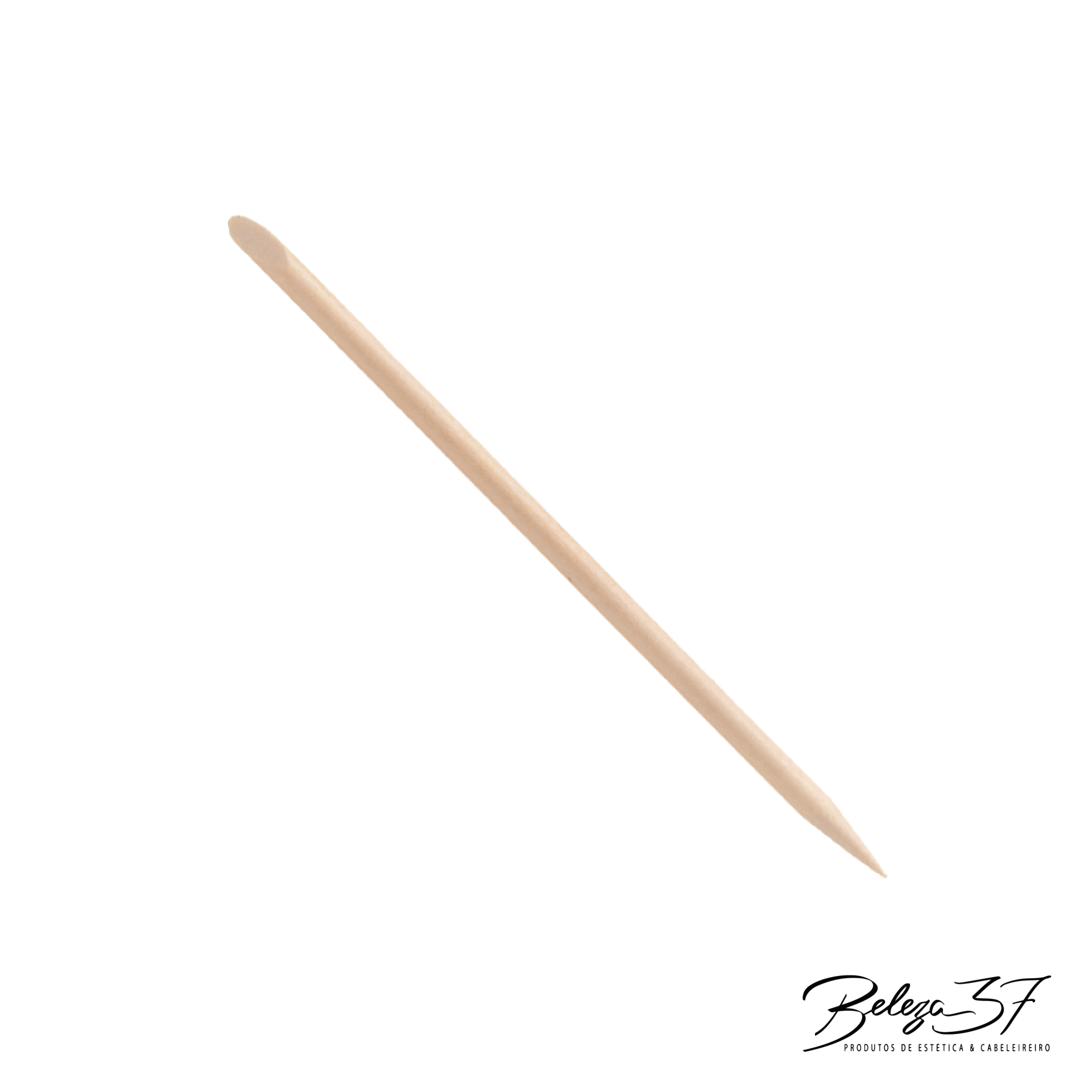 Espátula de madeira para unhas com fundo branco e assinatura Beleza 3F