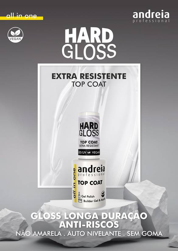 Verniz para unhas Andreia Professional Hard Gloss Top Coat em embalagem branca com texto em preto e fundo cinzento com pedras brancas
