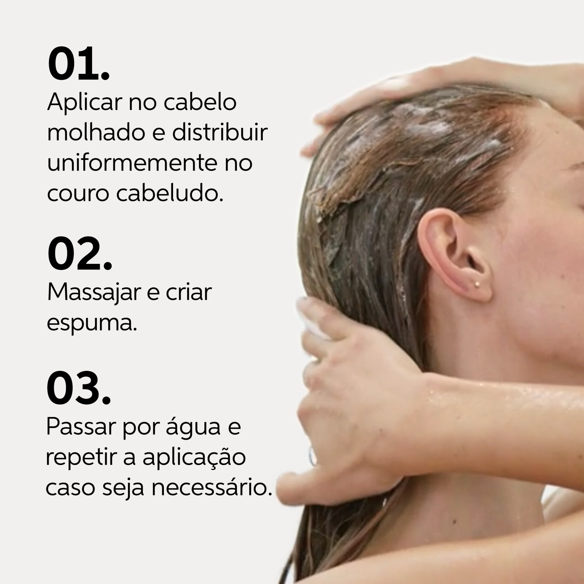 Modo de uso: Aplicar no cabelo húmido e fazer espuma. Passar abundantemente por água.