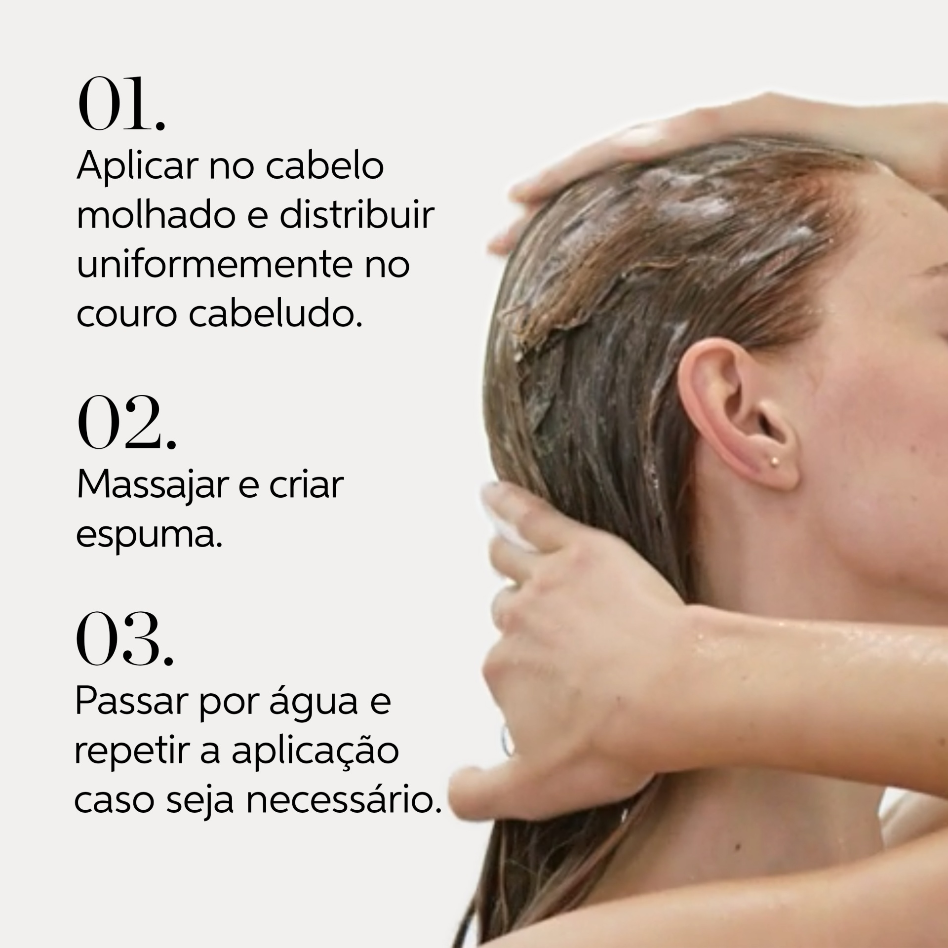 Modo de uso: Aplicar no cabelo húmido e fazer espuma. Passar abundantemente por água.