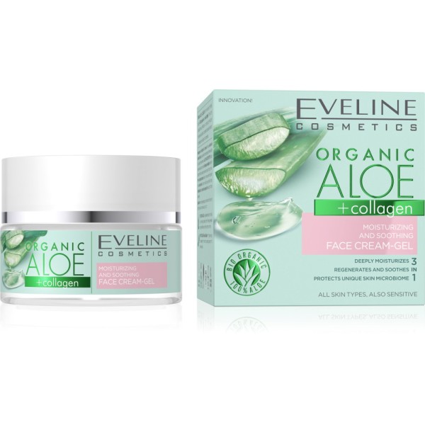 Creme gel de rosto Eveline Cosmetics Organic Aloe + Collagen com embalagem e caixa