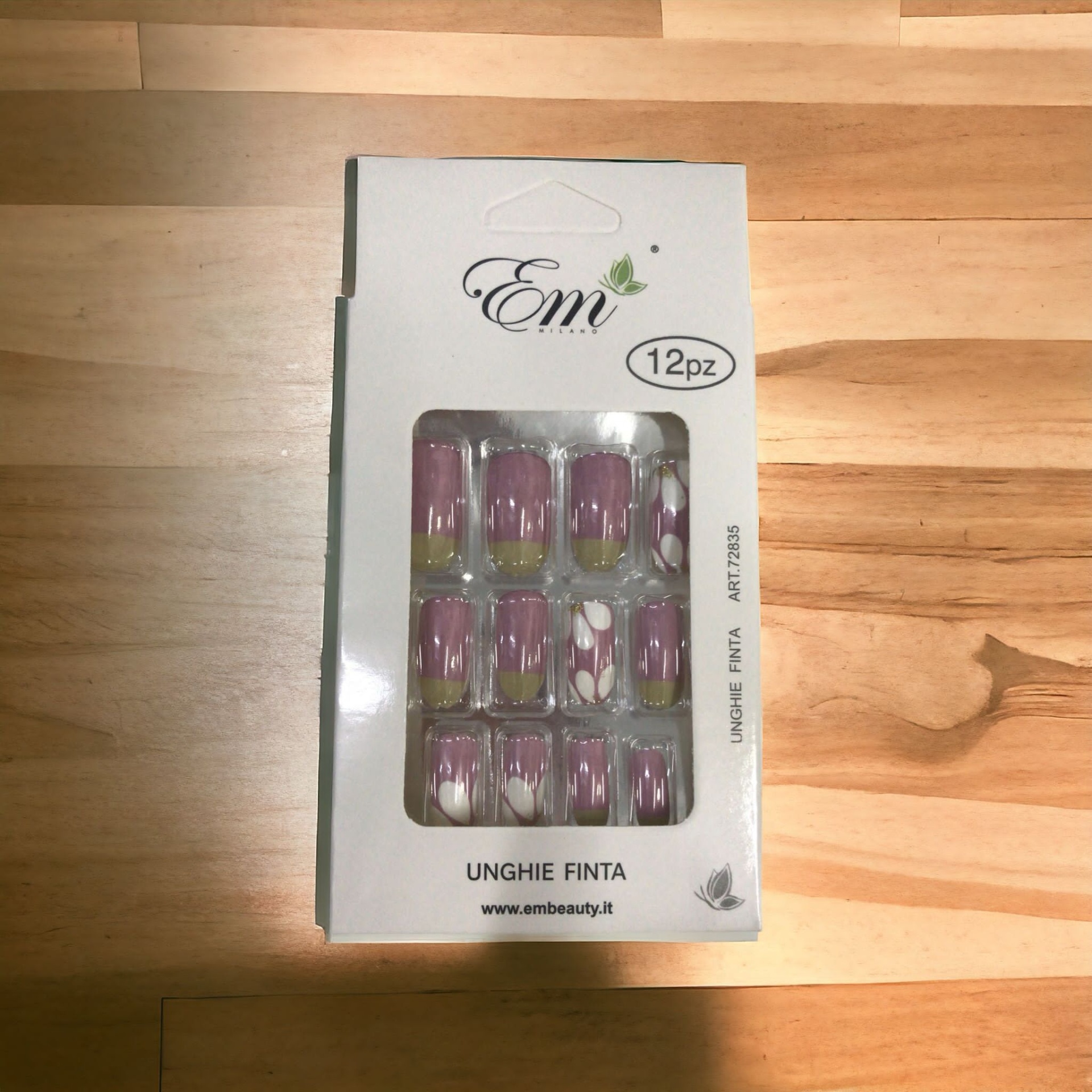Caixa de unhas falsas rosas com detalhes florais sobre madeira clara
