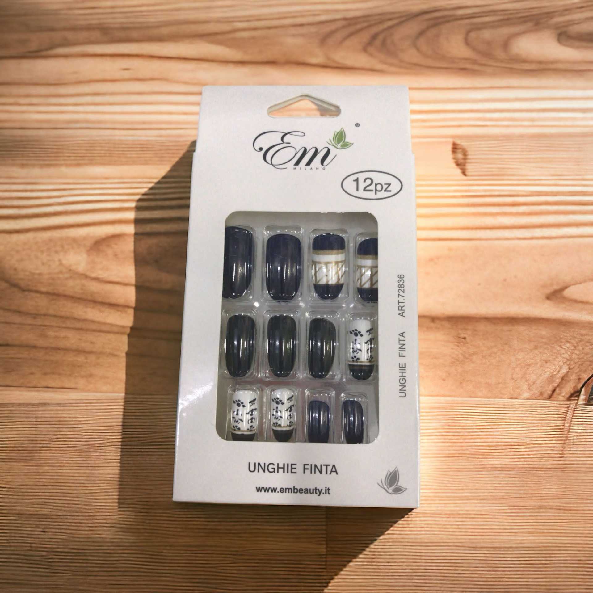 Caixa de unhas postiças azul escuro e branca com padrões florais
