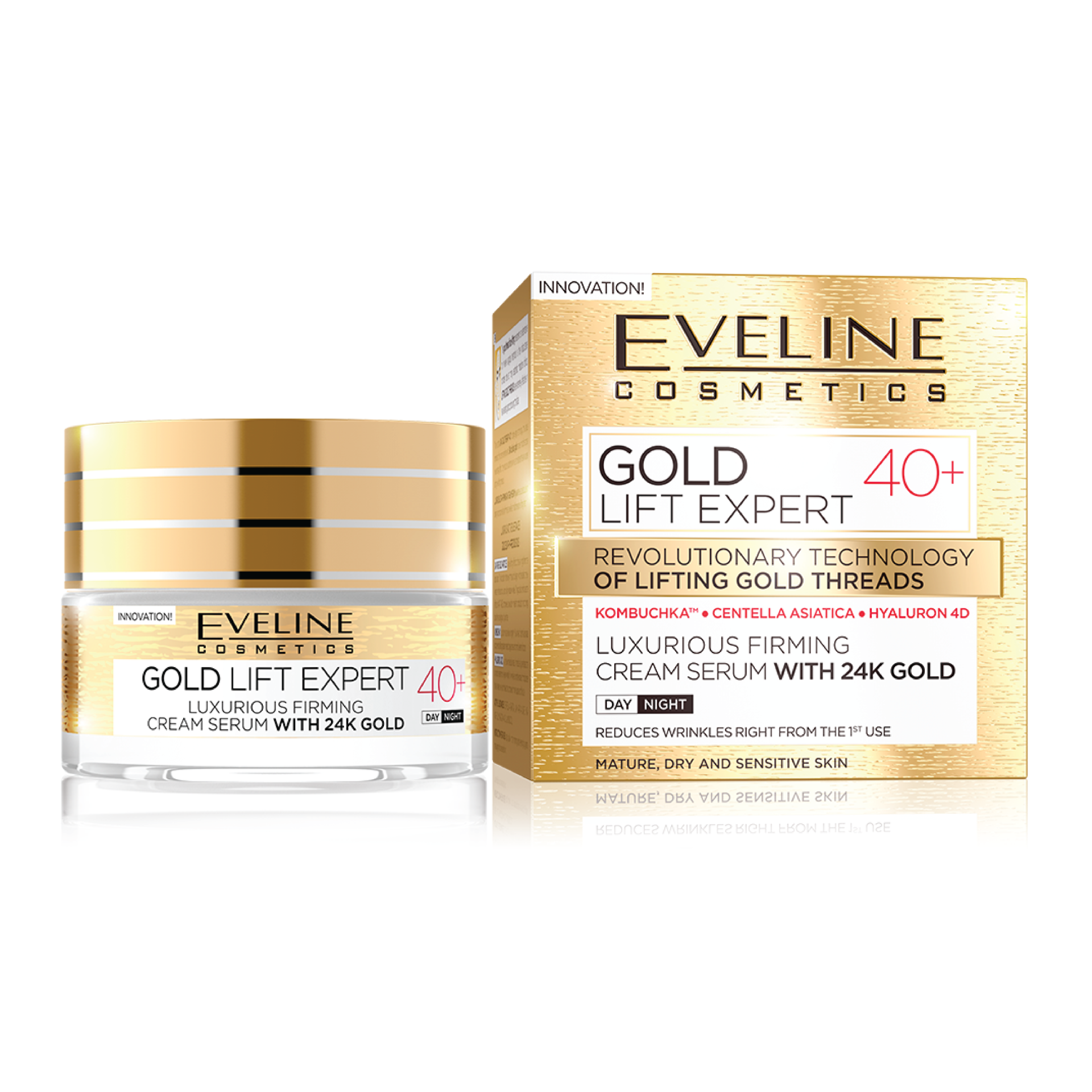 O Creme Anti idade Eveline 40+ graças às partículas de ouro de 24K estimula a reconstrução de tecidos, reduzindo visivelmente as rugas, O Ouro é um excelente portador de substâncias ativas que aumenta a eficácia dos complexos ANTI-AGE. Retarda a secreção de melanina e restaura o olhar.