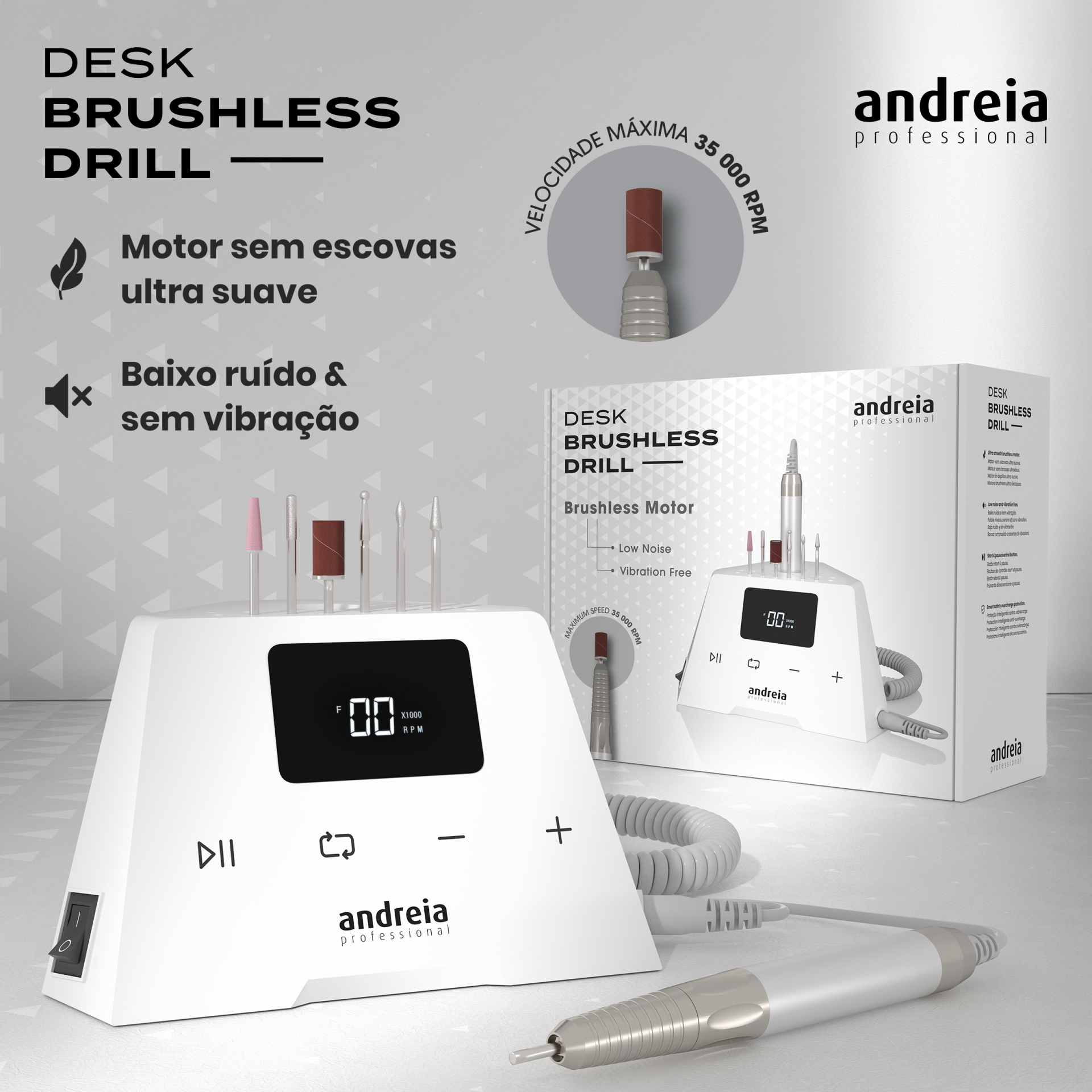 Desk Brushless Drill é um avançado aparelho de mesa, projetado para proporcionar uma experiência de polimento de unhas excecional.