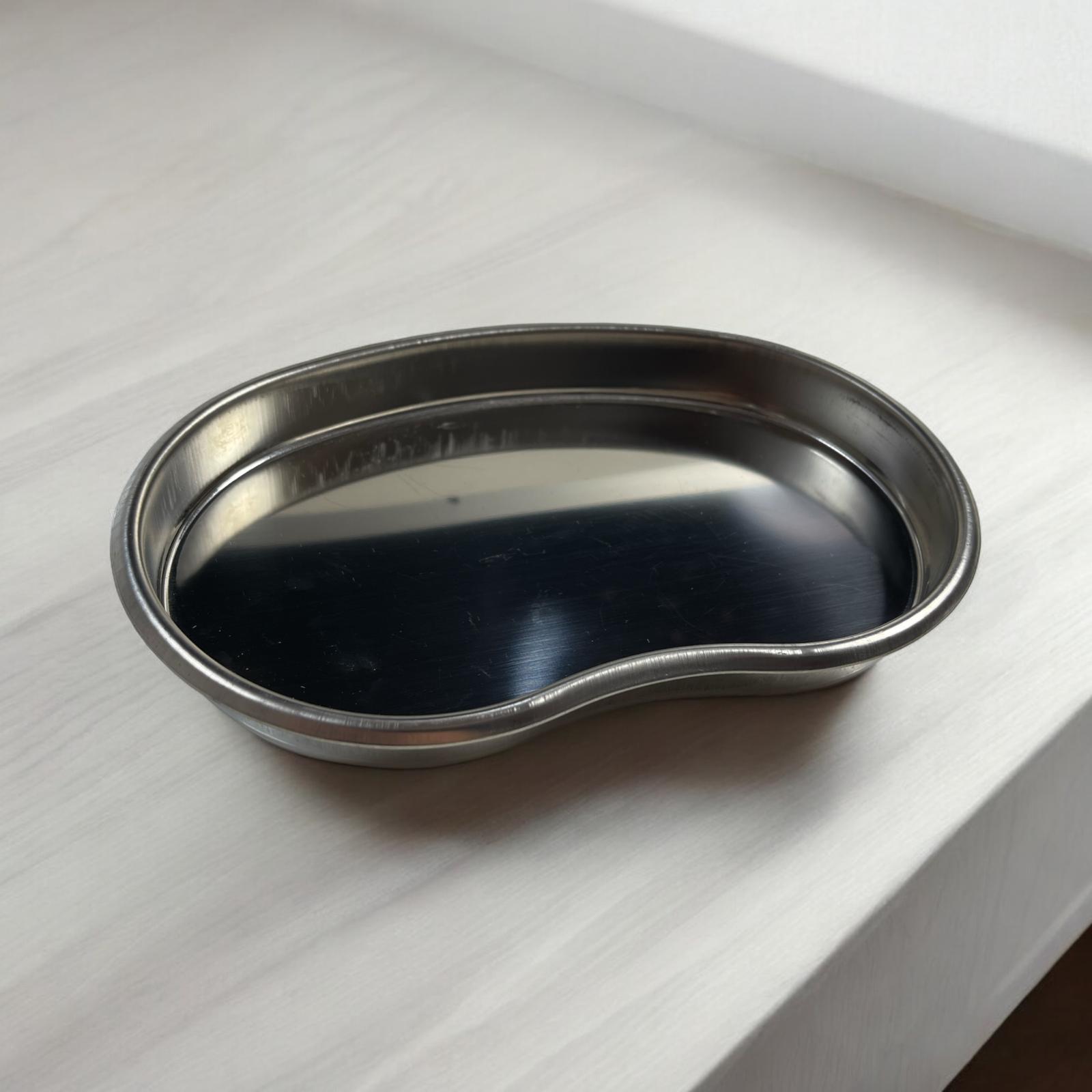 Prato metálico brilhante em forma de rim sobre superfície branca.