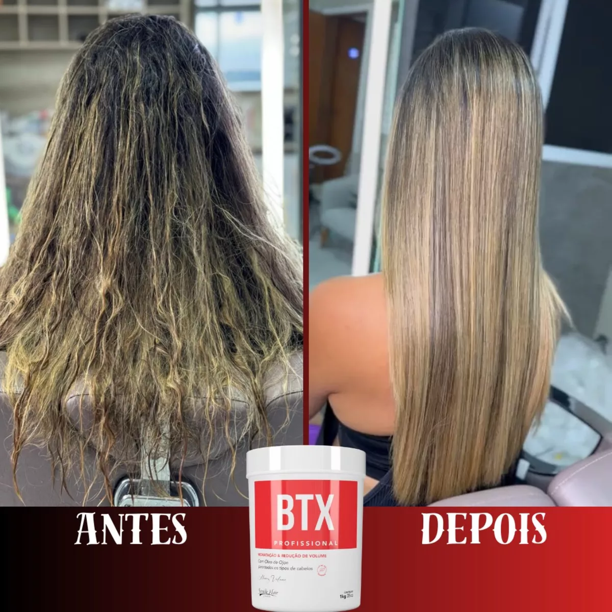Frasco branco com etiqueta vermelha BTX PROFISSIONAL e texto sobre redução de volume para cabelos