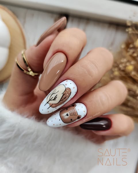 Unhas decoradas com verniz castanho claro, castanho escuro e branco, com desenhos de animais em fundo branco e pontos castanhos