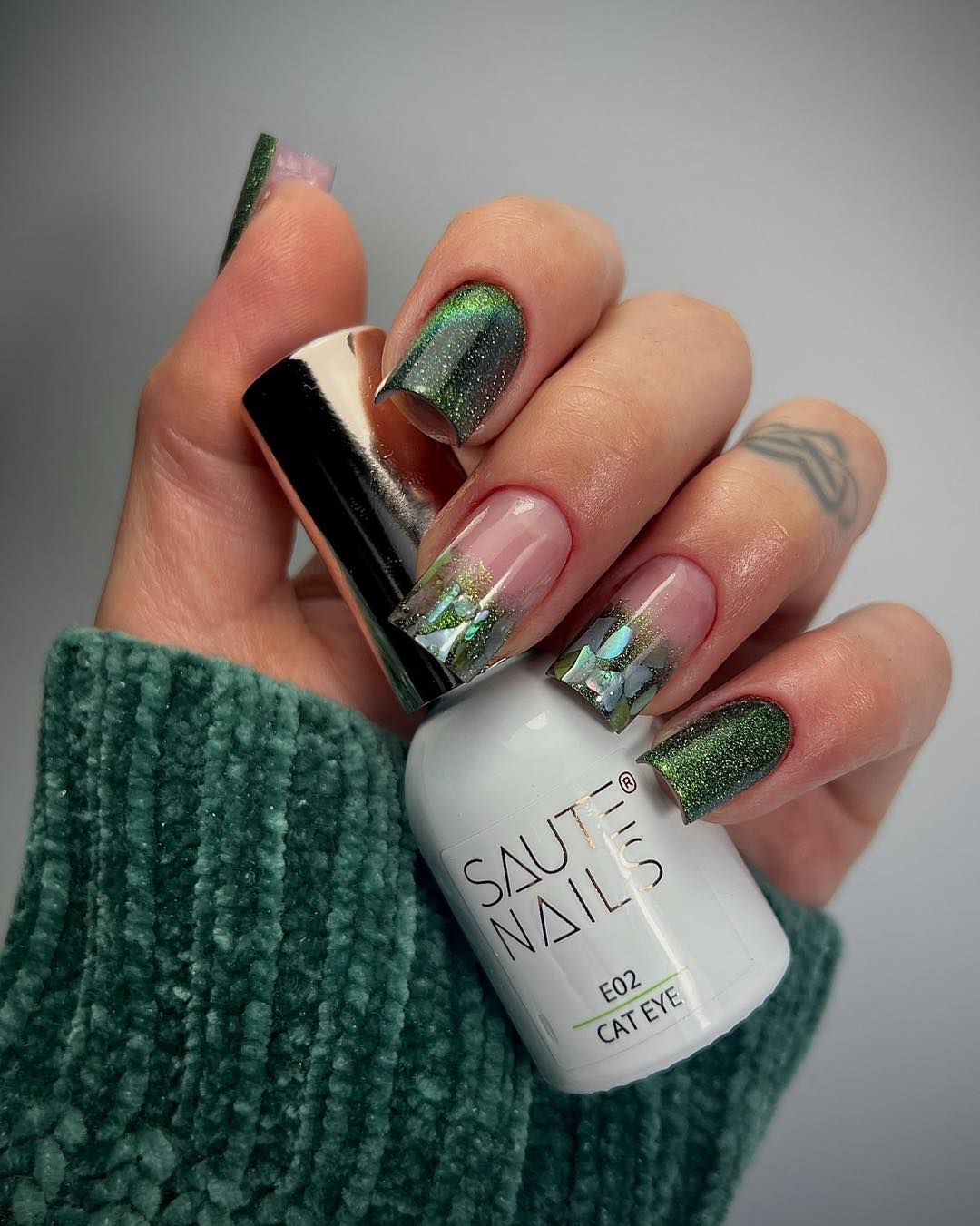 Descubra as Profundezas Hipnotizantes do Cat Eye Effect E02 da Saute Nails Este fascinante tom de verde intenso com reflexos místicos de ouro e tons claros de verde lembra florestas coloridas e folhas cintilantes.