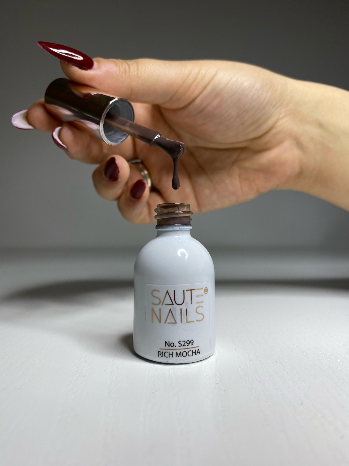 S299 Rich Mocha é um tom castanho profundo e intenso que emana elegância e classe intemporal. O seu tom rico e achocolatado lembra a essência do café moído fresco, criando estilizações cheias de sofisticação e caráter. É a cor para mulheres que apreciam soluções clássicas, mas ao mesmo tempo modernas. A sua consistência cremosa garante uma aplicação fácil sem manchas, com cobertura perfeita em apenas duas camadas finas. É uma escolha ideal tanto para uma manicure uniforme, quanto para combinar com tons mais claros da coleção Mocha Essence, criando efeitos de transições subtis de tons. A sua intensidade faz com que funcione bem em qualquer estilização – desde unhas elegantes e clássicas até decorações arrojadas e modernas.