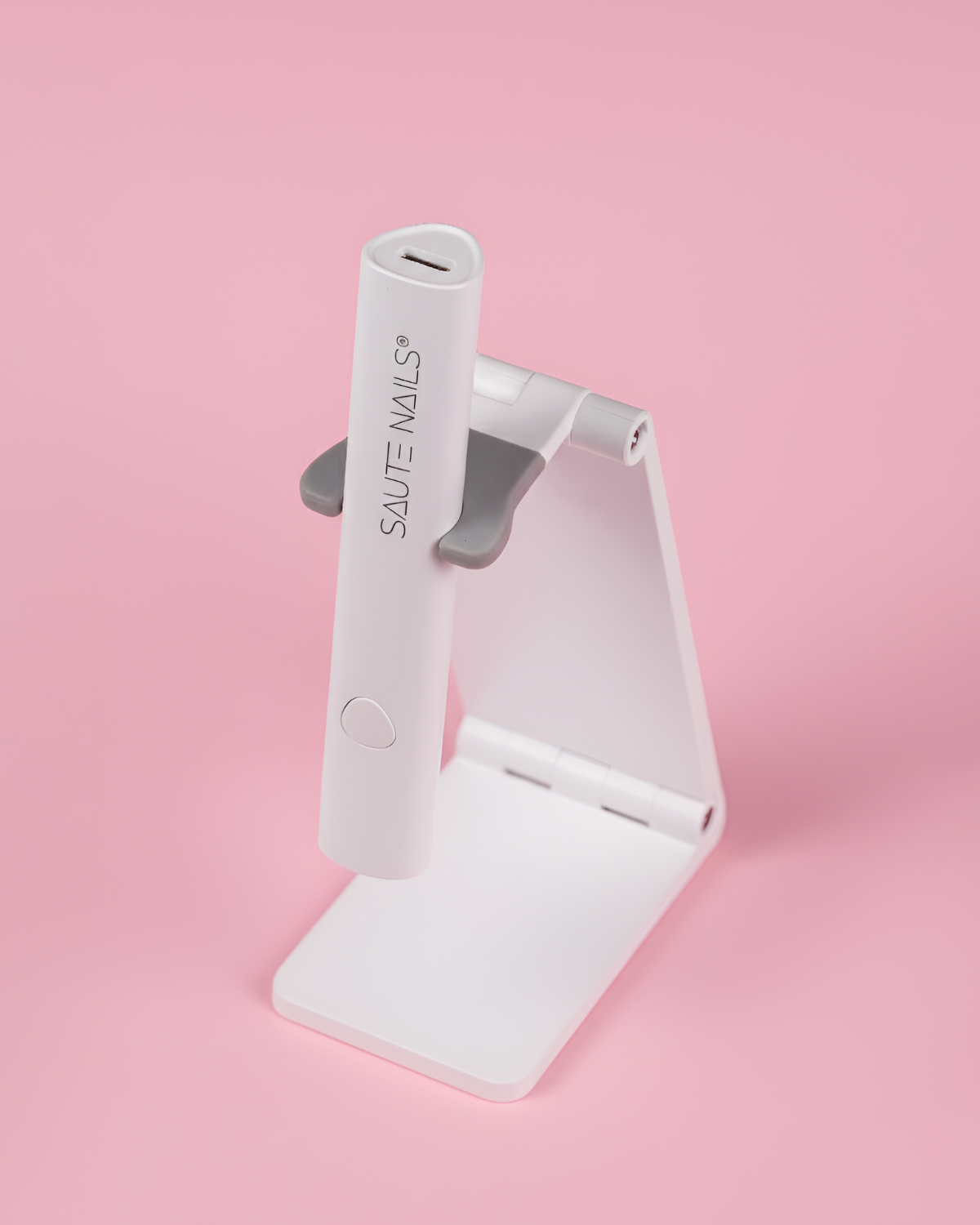 Mini lâmpada UV/LED – dispositivo compacto para cura, com dois modos de tempo (20 s e 60 s). Possui bateria de 200 mAh e cabo de carregamento, oferecendo mobilidade e praticidade.