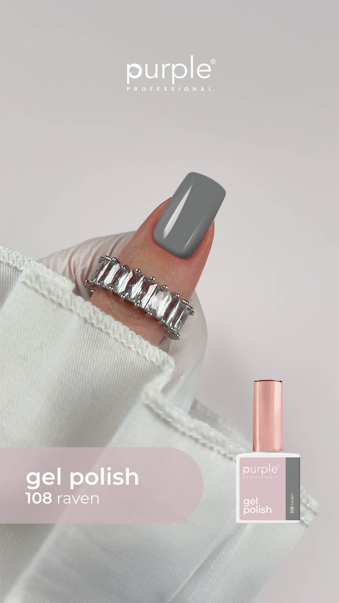 Unha com verniz gel cinzento escuro 108 raven da Purple Professional com anel prateado e frasco do verniz