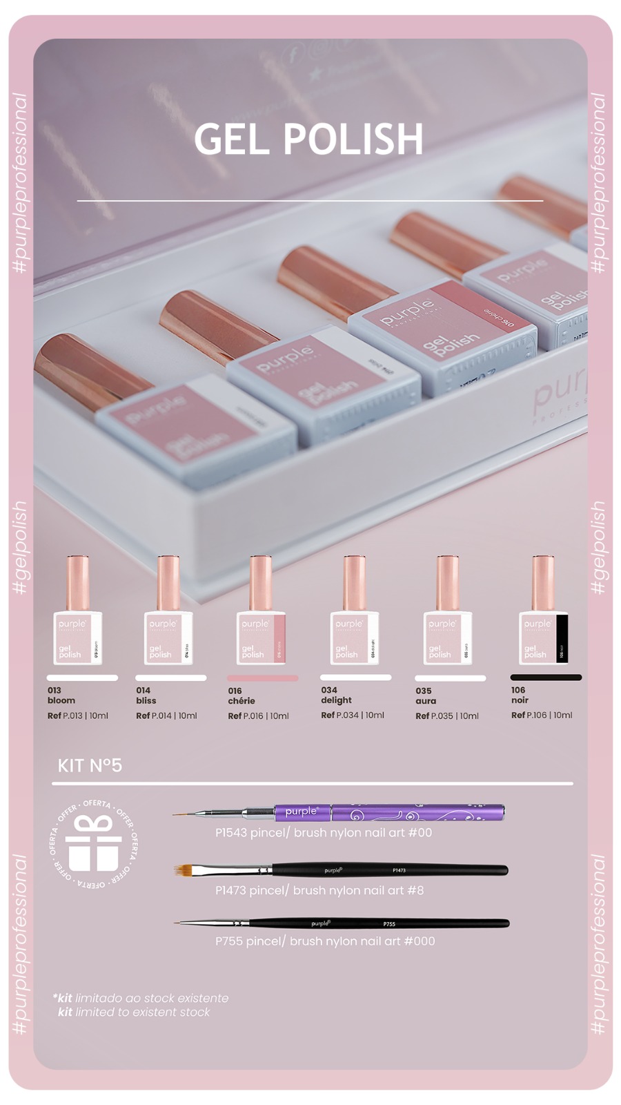 Home Purple — Verniz Gel NOVO KIT Coleção Purple NRº5 (013+014+016+034+035+106 + Oferta 3 Pincéis -5% KIT Coleção Purple NRº5 (013+014+016+034+035+106 + Oferta 3 Pincéis 3 unidades em stock | SKU: B8860 40,23 € 42,35 € Desconto de 5%. IVA incluído. Desconto do dia do Pai Desconto imediato de 2,12 € (5%) neste produto. Válido de 16 de Março de 2026 às 00:00 até 23 de Março de 2026 às 00:00. Compre este produto e ganhe 201 Pontos! Comprar Contactar Adicionar à wishlist Nova Linha Verniz Gel Purple – Kit 5 Composta por 6 cores de alta cobertura: Gel Polish Purple - 013 Bloom 10ml (equivalência P2036 Forever Happy)Gel Polish Purple - 014 Bliss 10ml (equivalência P2138 Forever Queen)Gel Polish Purple - 016 Chérie 10ml (equivalência P2038 Forever Pretty)Gel Polish Purple - 034 Delight 10ml (equivalência P2219 Forever Adorable)Gel Polish Purple - 035 Aura 10ml (equivalência P2035 Forever Angel)Gel Polish Purple - 116 Endless 10ml e(quivalência P2336 Spread Smiles) Oferta: 1 Pincel Nylon Nail Art #00 (P1543) + 1 Pincel Nylon Nail Art Fork (P1473) + 1 Pincel Nylon Nail Art #000 (P755) Marca Purple Professional Características Partilhar