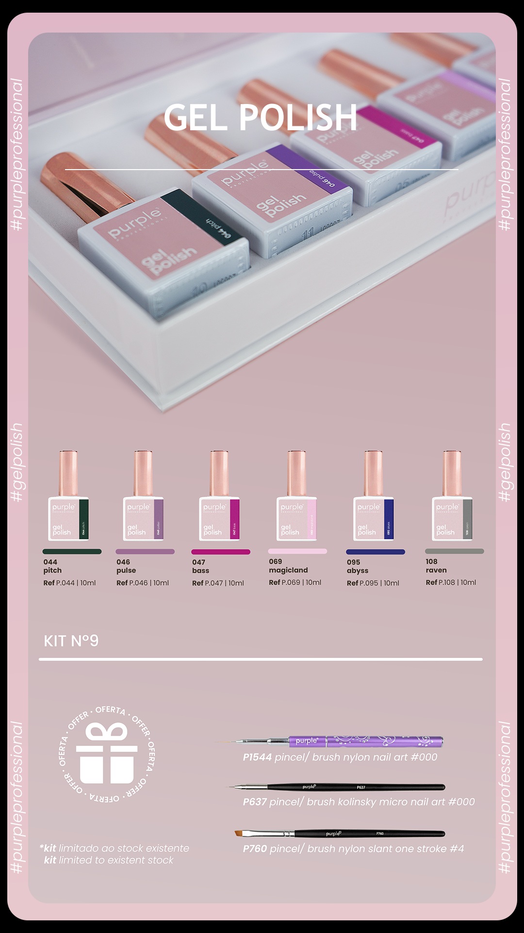 Home Purple — Verniz Gel NOVO KIT Coleção Purple NRº9 (044+046+047+069+095+108) + Oferta 3 Pincéis -5% KIT Coleção Purple NRº9 (044+046+047+069+095+108) + Oferta 3 Pincéis 1 unidades em stock | SKU: B8863 40,23 € 42,35 € Desconto de 5%. IVA incluído. Desconto do dia do Pai Desconto imediato de 2,12 € (5%) neste produto. Válido de 16 de Março de 2026 às 00:00 até 23 de Março de 2026 às 00:00. Compre este produto e ganhe 201 Pontos! Comprar Contactar Adicionar à wishlist KIT Coleção Purple NRº9 (044+046+047+069+095+108) + oferta 1 Pincel Nylon Nail Art #000(P1544) + 1 Pincel Nylon Micro Nail Art #000(P637) + 1 Pincel Nylon Slant One Stroke #4 (P760) Composta por 6 cores de alta cobertura: Gel Polish Purple - 044 Pitch 10ml - equivalência P2278 Love Is EternalGel Polish Purple - 046 Pulse 10ml - equivalência P2235 Really LuckyGel Polish Purple - 047 Bass 10ml - equivalência P2147 Hope in y. HeartGel Polish Purple - 069 Magicland 10ml - equivalência P2263 Baby BibGel Polish Purple - 095 Abyss 10ml - equivalência P2029 Winter Myst. SkyGel Polish Purple - 108 Raven 10ml - equivalência P2302 All I Need is Health Oferta: 1 saco algodão purple + 1 rolo de toalhas descartáveis purple Marca Purple Professional Características Partilhar