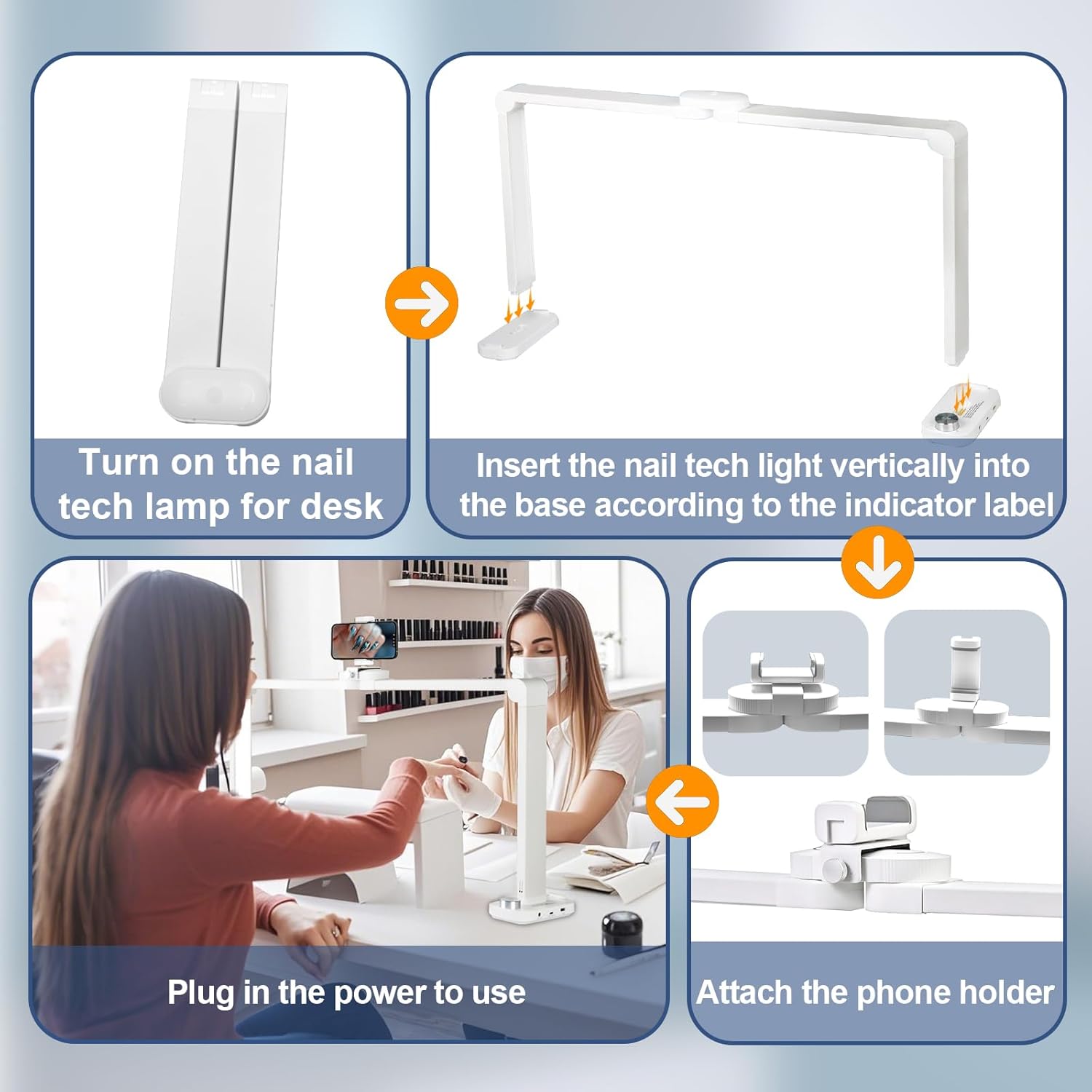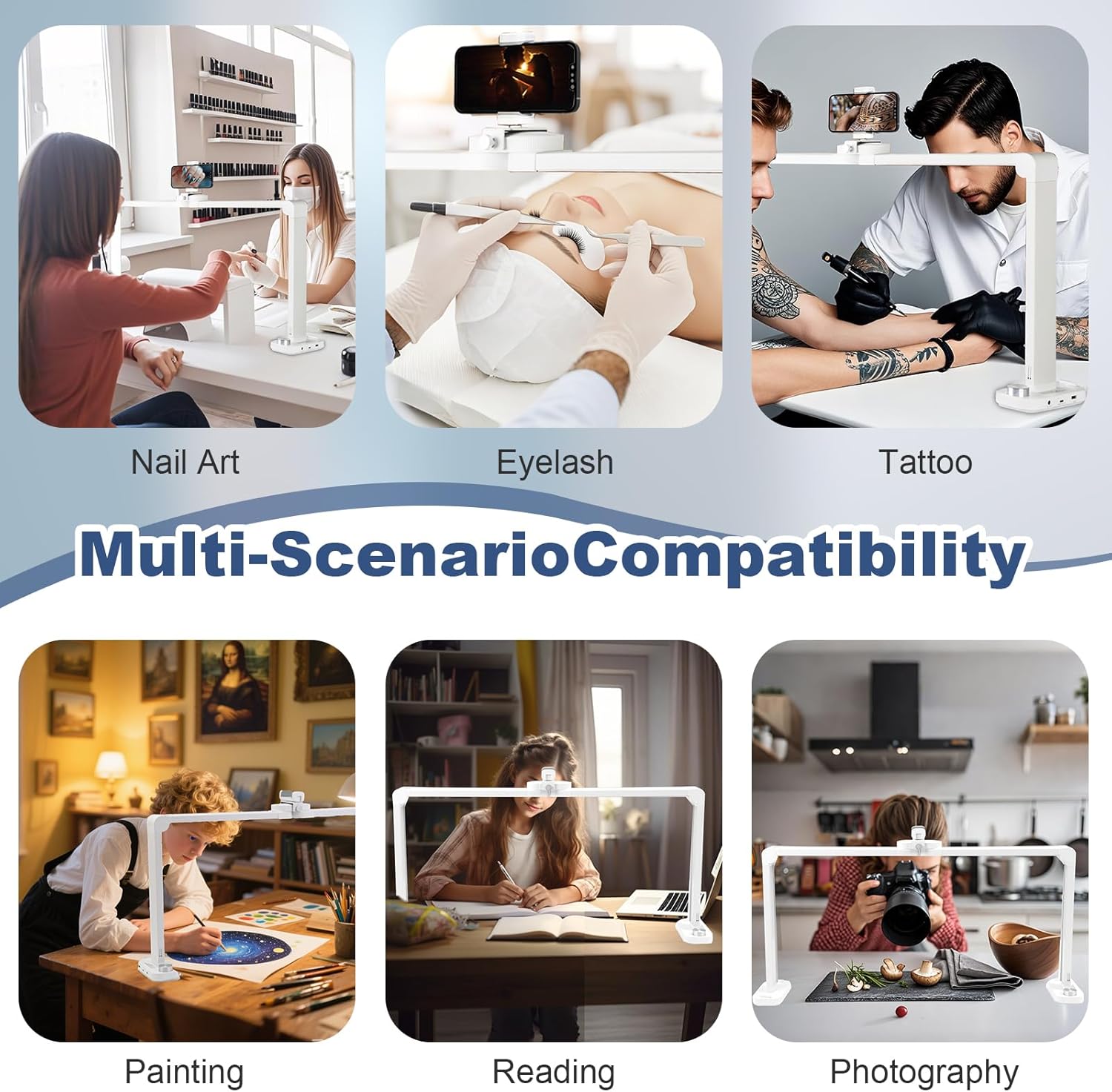 Transforme o seu espaço de trabalho com este candeeiro de mesa extragrande em forma de meia-lua, concebido para profissionais exigentes nas áreas de manicure, estética e tatuagem. Com 85 cm de largura e um design dobrável inovador, este candeeiro oferece uma iluminação ampla, uniforme e sem sombras, garantindo conforto tanto para o profissional como para o cliente.