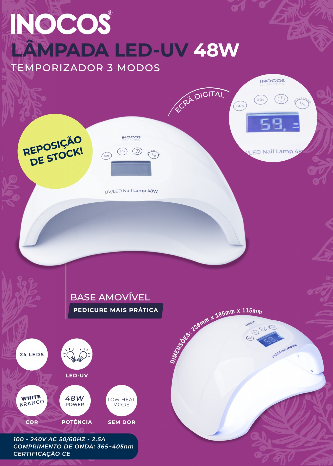 Home Catalisadores Catalisador Inocos LED-UV 48W Catalisador Inocos LED-UV 48W 0 unidades em stock | SKU: B3087 51,50 € Desconto de %. IVA incluído. Compre este produto e ganhe 257 Pontos! O produto encontra-se sem stock. Adicionar à wishlist Características: - Base removível para pedicure; - 24 Leds; - Potência de 48w; - Low Heat Mode (sem dor); - Écrã digital - Temporizador com 4 modos; - Dimensões: 236x195x115mm - Garantia: 1 ano Marca Inocos Características Partilhar