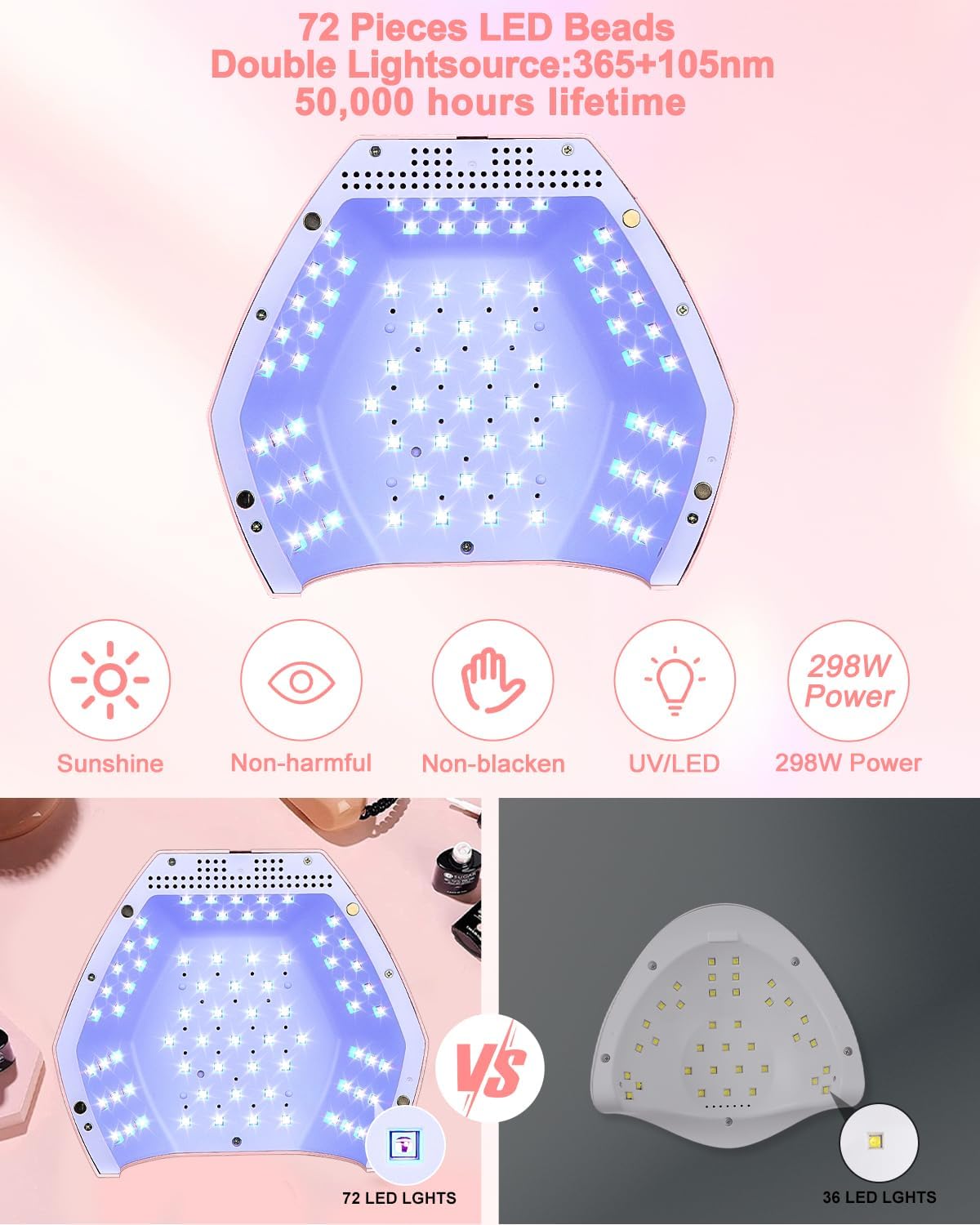 Desempenho Superior com 72 LEDs: Este candeeiro UV LED para unhas, com uma impressionante potência de 298 W e 72 bolas de luz distribuídas uniformemente, garante uma secagem rápida e eficiente.