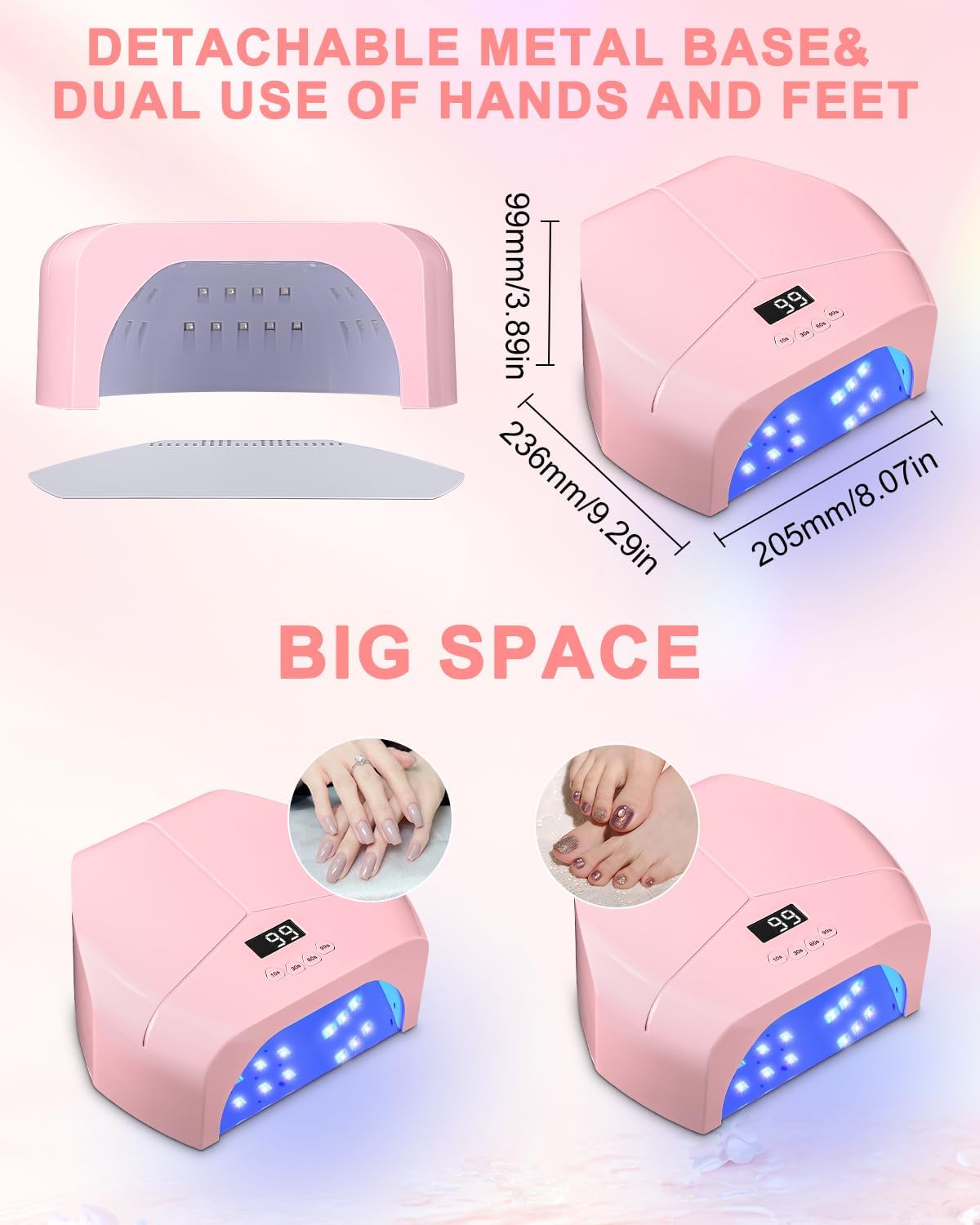 Base Desmontável e Espaçosa: Com um design de chassis magnético, este candeeiro de unhas profissional oferece um espaço ampliado quando desmontado. Seja para manicure ou pedicure, proporciona maior conforto e conveniência. A base de aço inoxidável facilita a secagem do polegar e torna a limpeza e desinfeção mais simples para uso subsequente.