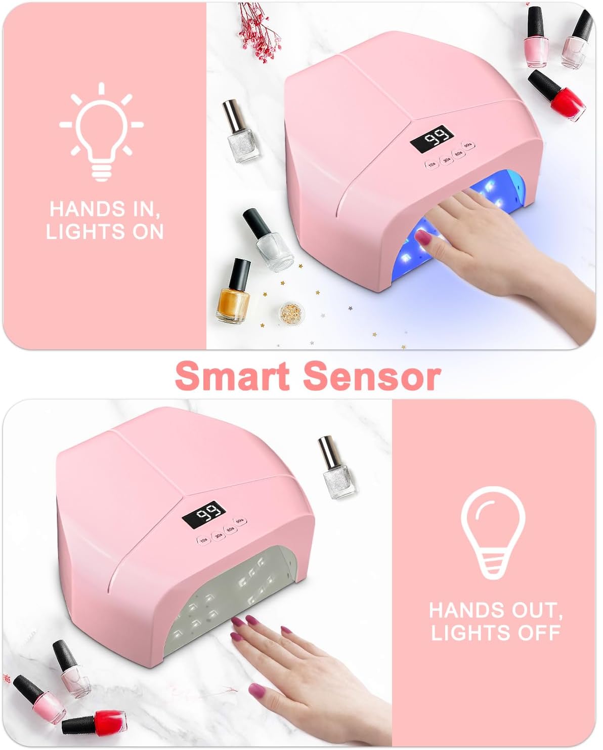 Temporizadores e Sensores Inteligentes: Equipado com quatro temporizadores (10s, 30s, 60s, 99s), permite controlar livremente o tempo de cura. Os modos de 30s e 60s proporcionam uma secagem rápida, enquanto o modo de baixa temperatura alivia o desconforto da manicure. A exibição do tempo restante no secador de unhas torna-o fácil de usar e oferece uma experiência inovadora.