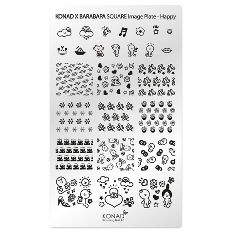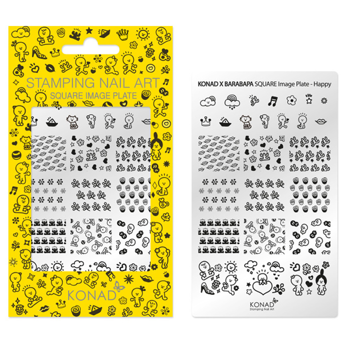 Placa de estampagem para unhas KONAD com desenhos diversos em cartão amarelo e branca.